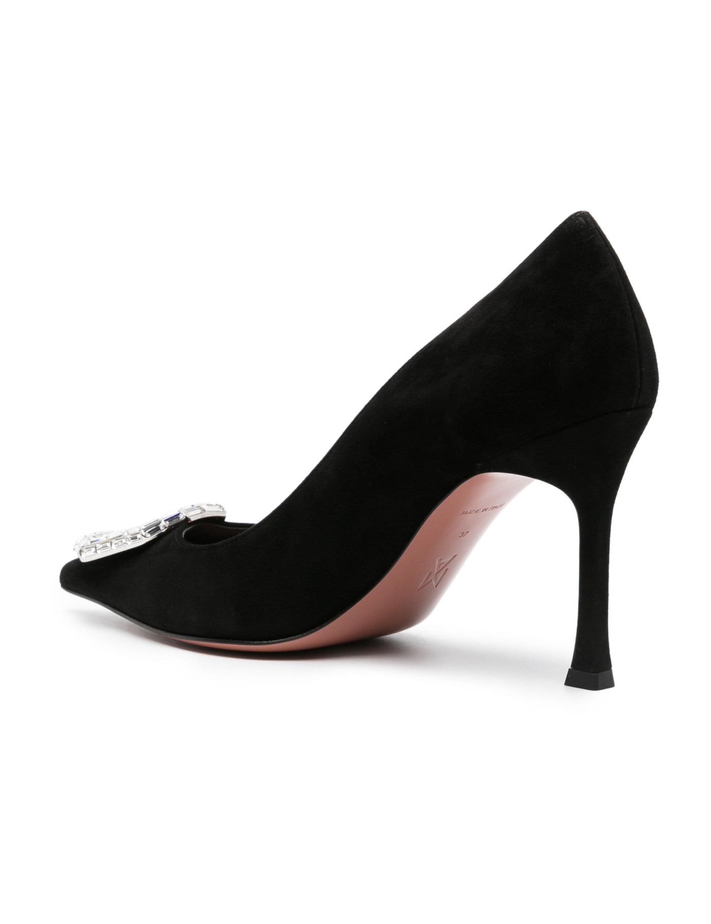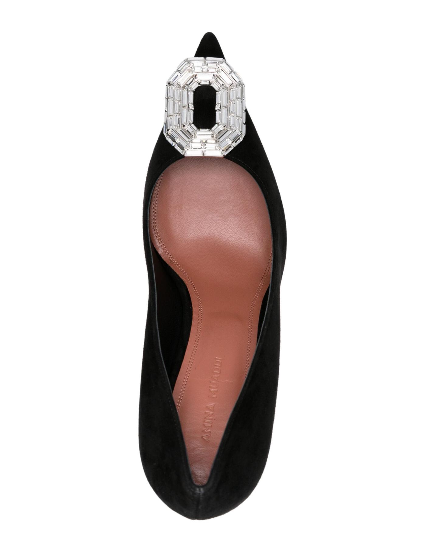 Sitting atop a sleek stiletto heel, this black iteration of the Camelia pumps is crafted in Italy from smooth black suede that complements its crystal-embellishment at the toe - a signature touch from Amina Muaddi.