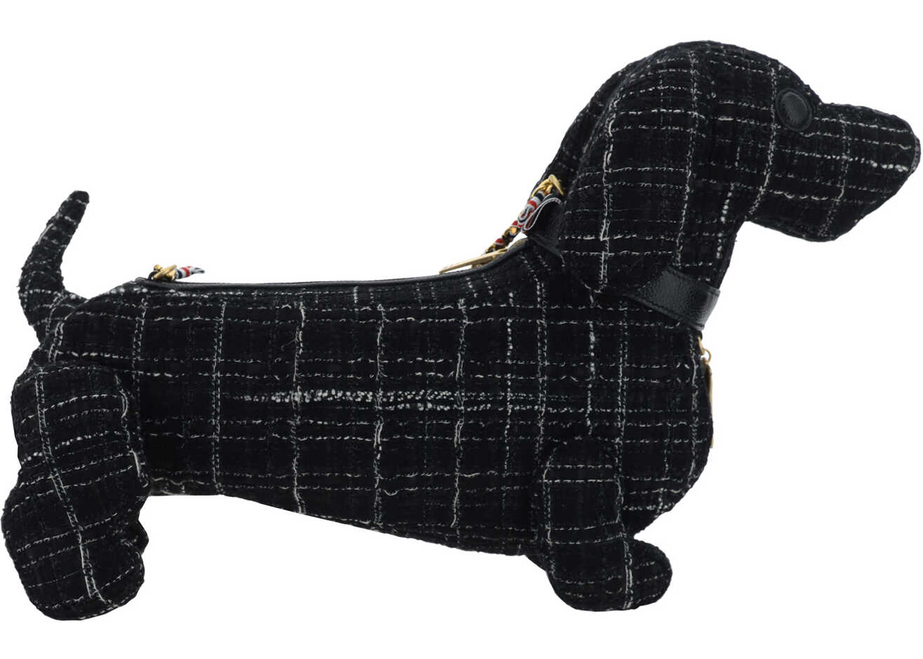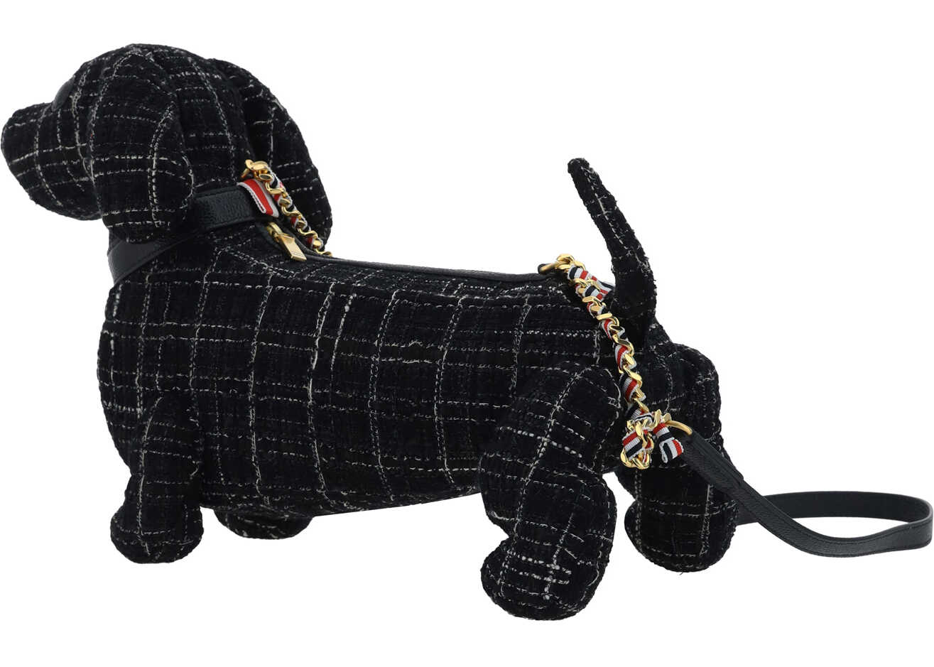 Cotton Hector Mini Shoulder Bag by Thom Browne, zipper top closure, removable flat leather shoulder strap with iconic stripe detail, single interior compartment, all-over repeating check pattern, metal applique plaque, brand's iconic Hector dachshund shape.