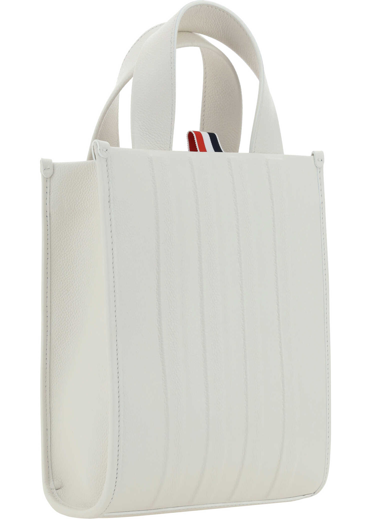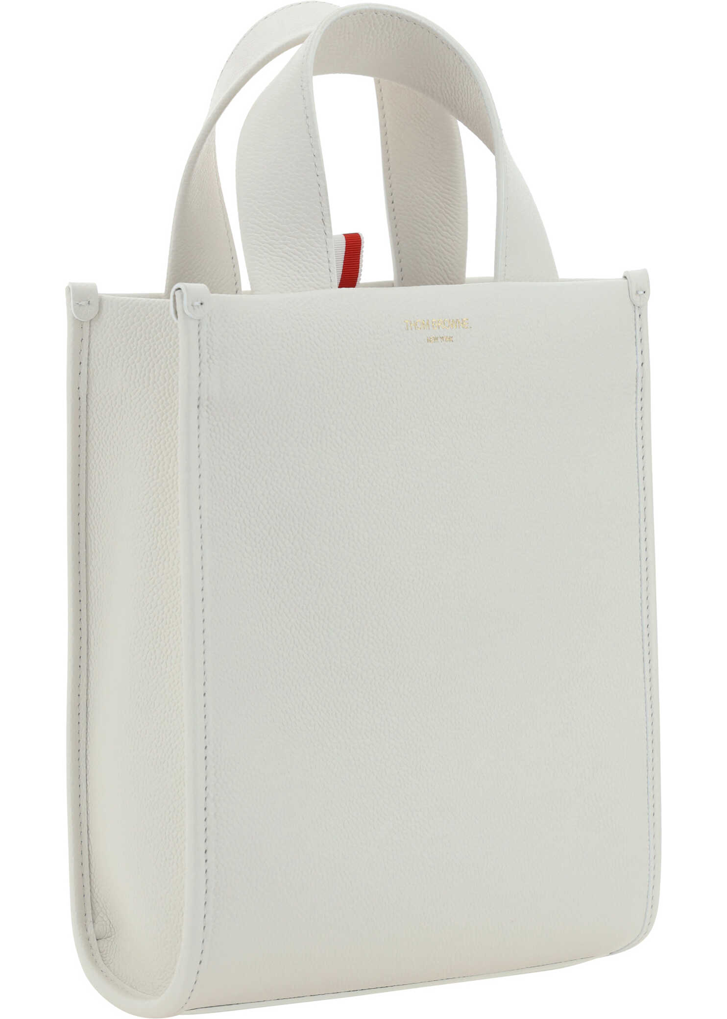 Leather Hand Bag by Thom Browne, grained leather design, two flat top handles, removable shoulder strap, iconic brand monogram press-stamped on front, single interior compartment.