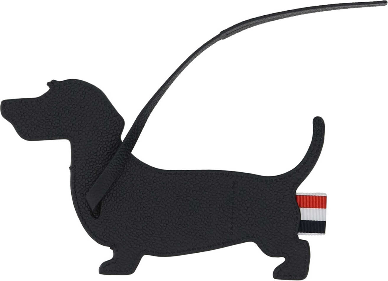 Hector Luggage Tag di Thom Browne, knurled leather design, iconic colored band detail, iconic Hector dachshund shape of the brand.