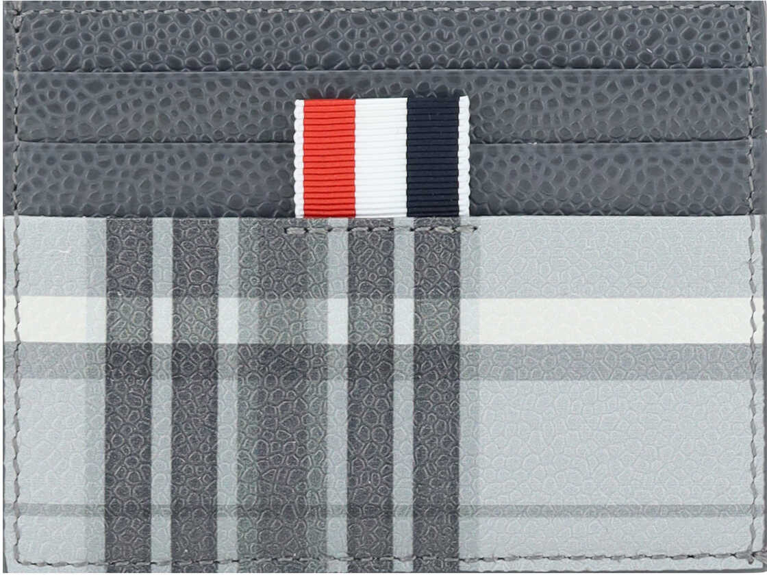 Leather Card Holder by Thom Browne, grained leather design, card slot on front, iconic tab with brand colors.