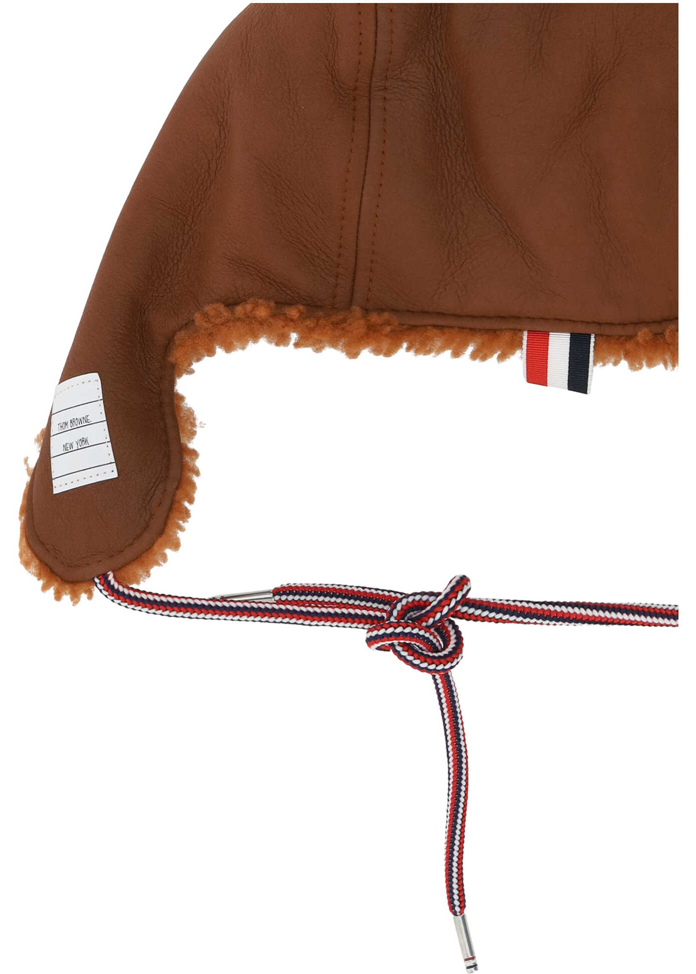 Leather Aviator Hat by Thom Browne, soft shearling design in inner panel, under-chin closure by drawstrings with iconic brand colors, fabric detail with iconic brand colored bands, patch with iconic brand monogram on side panel.