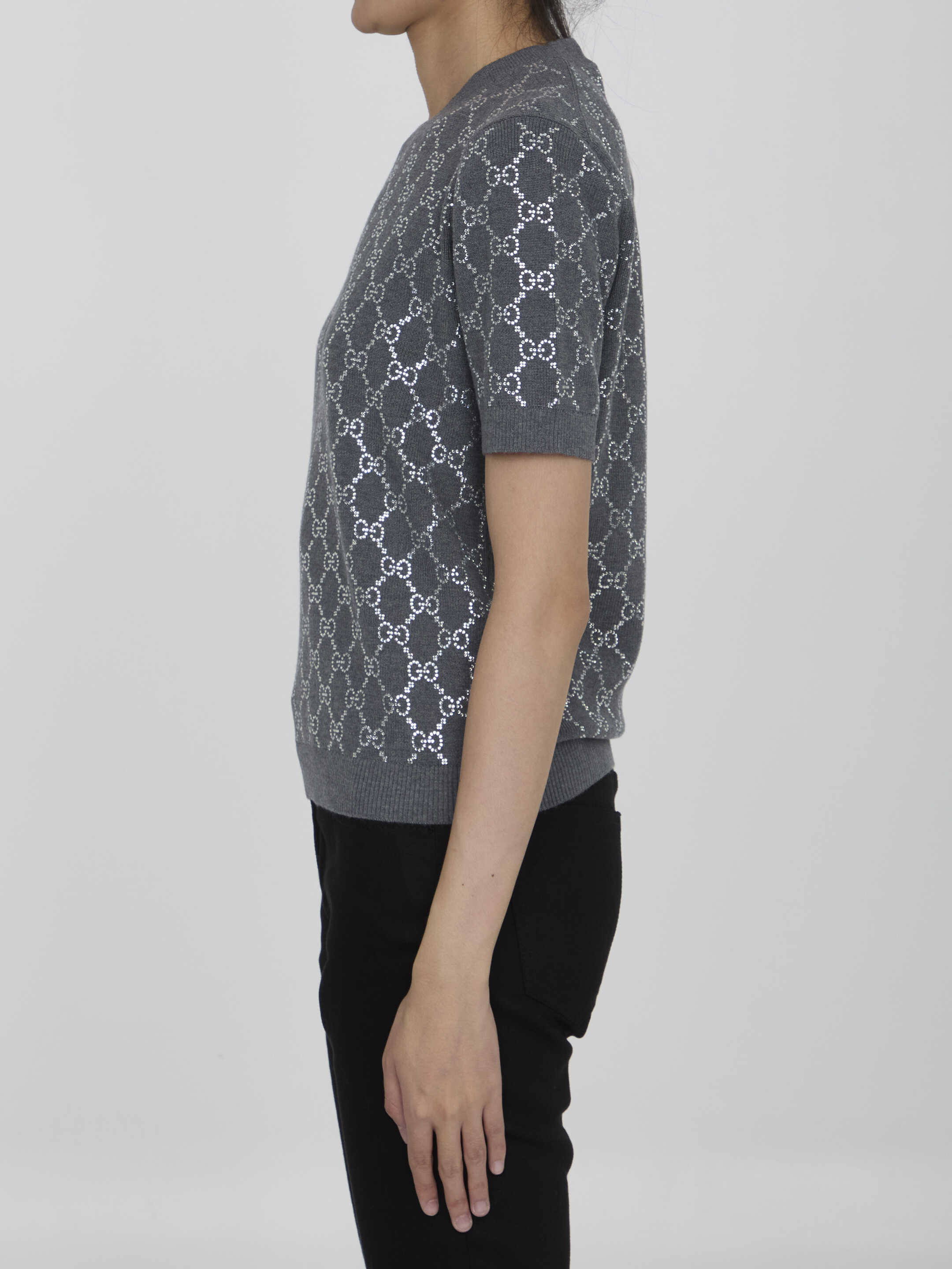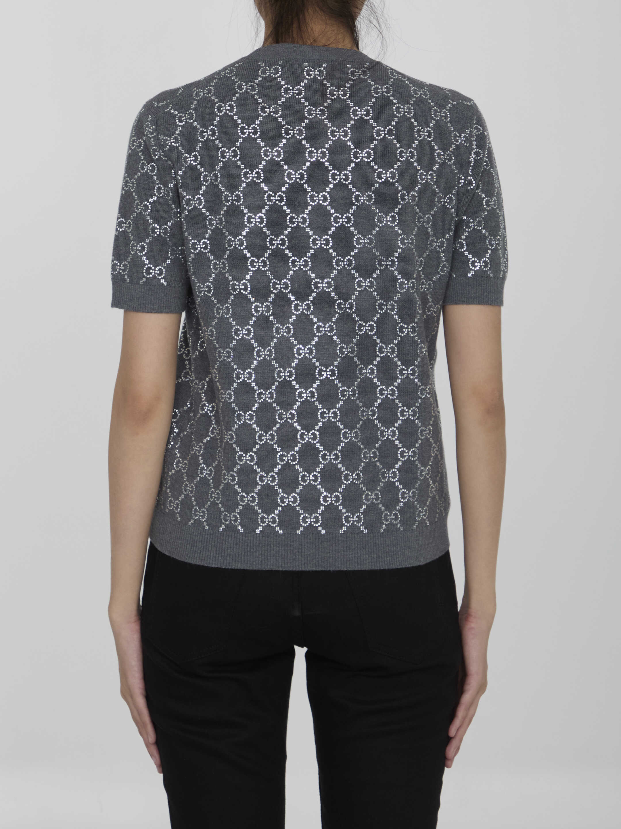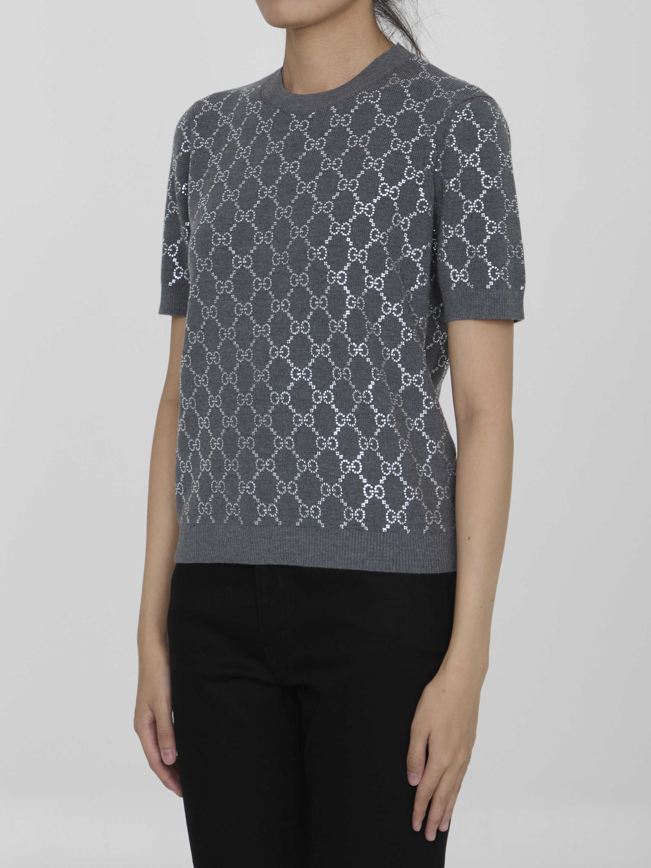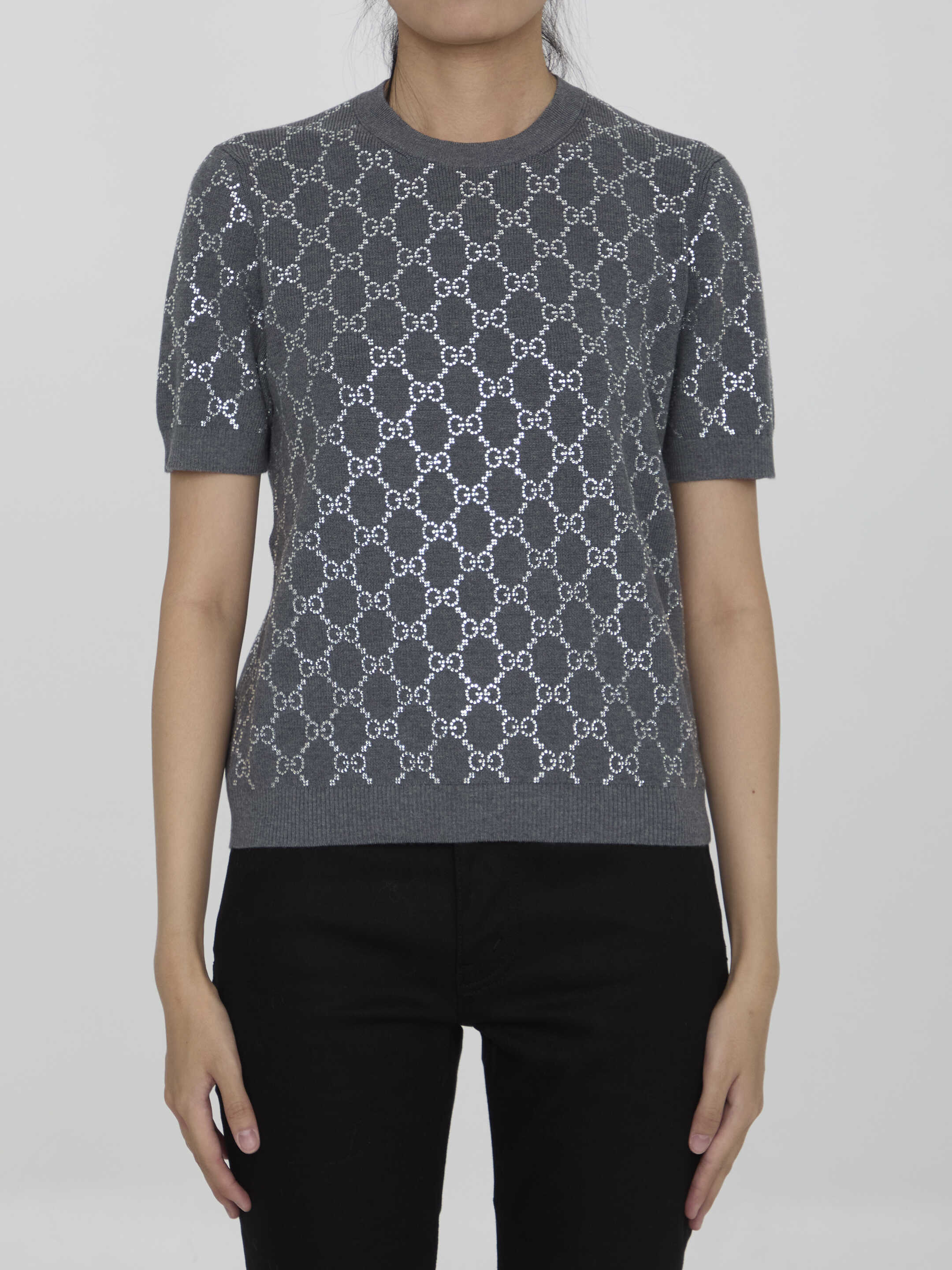 Short-sleeved crewneck jumper in grey wool with all-over GG motif in rhinestones. Ribbed collar, cuffs and hem. Regular fit.