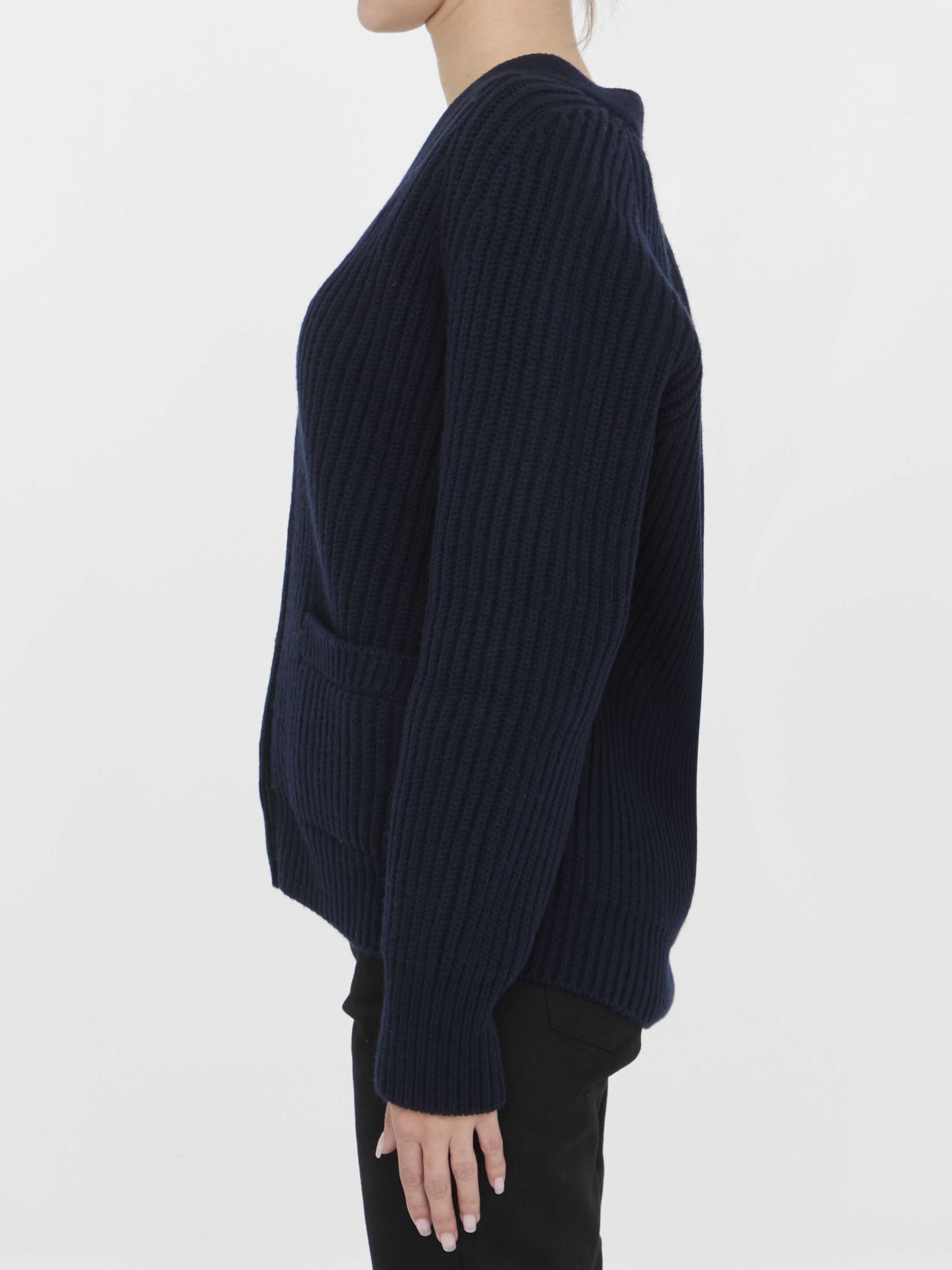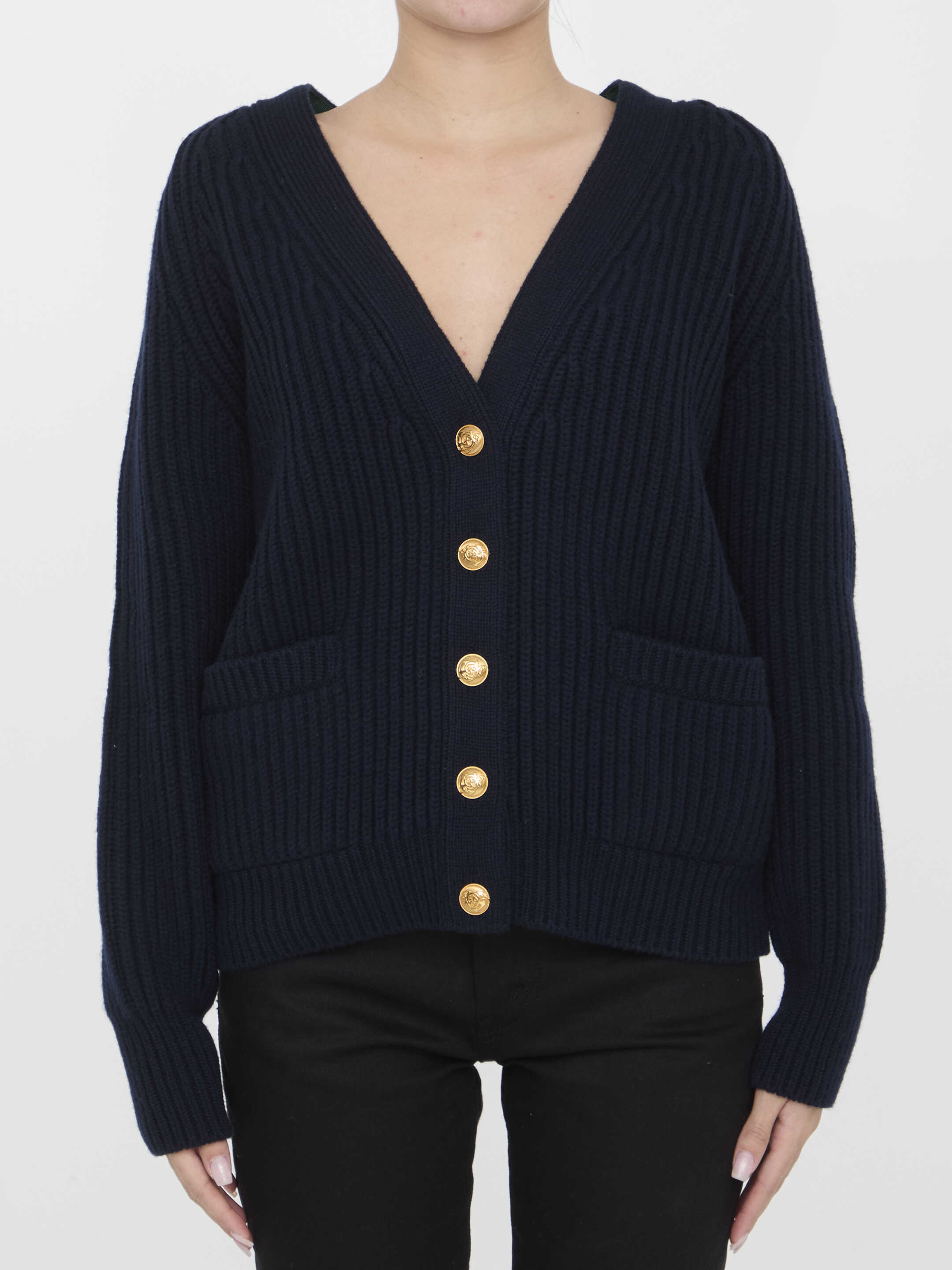 Navy blue ribbed wool and cashmere cardigan. It features V-neckline, front button closure with gold-tone Interlocking G and anchor, two front patch pockets and Web detailing on the inside. Relaxed fit.