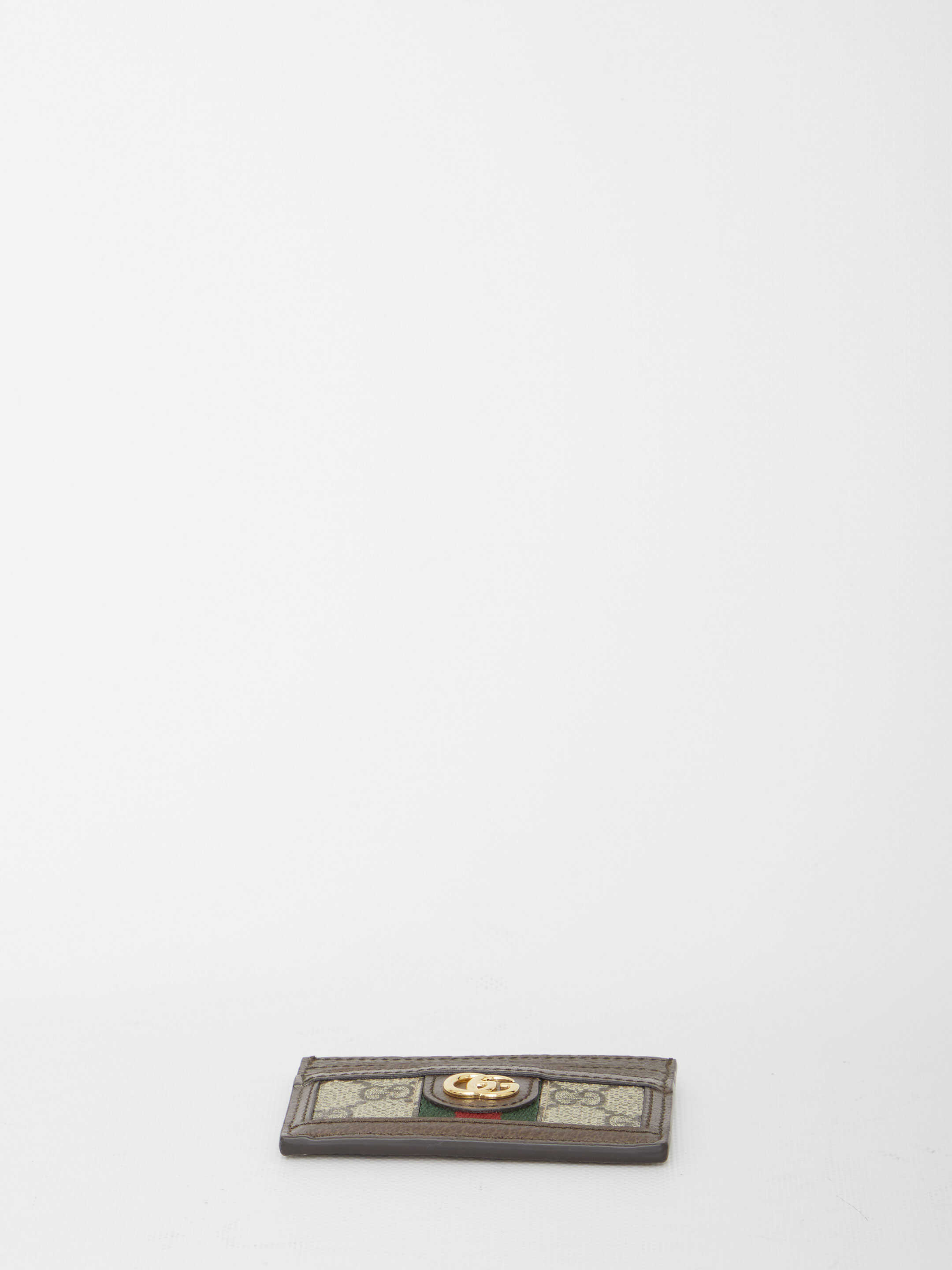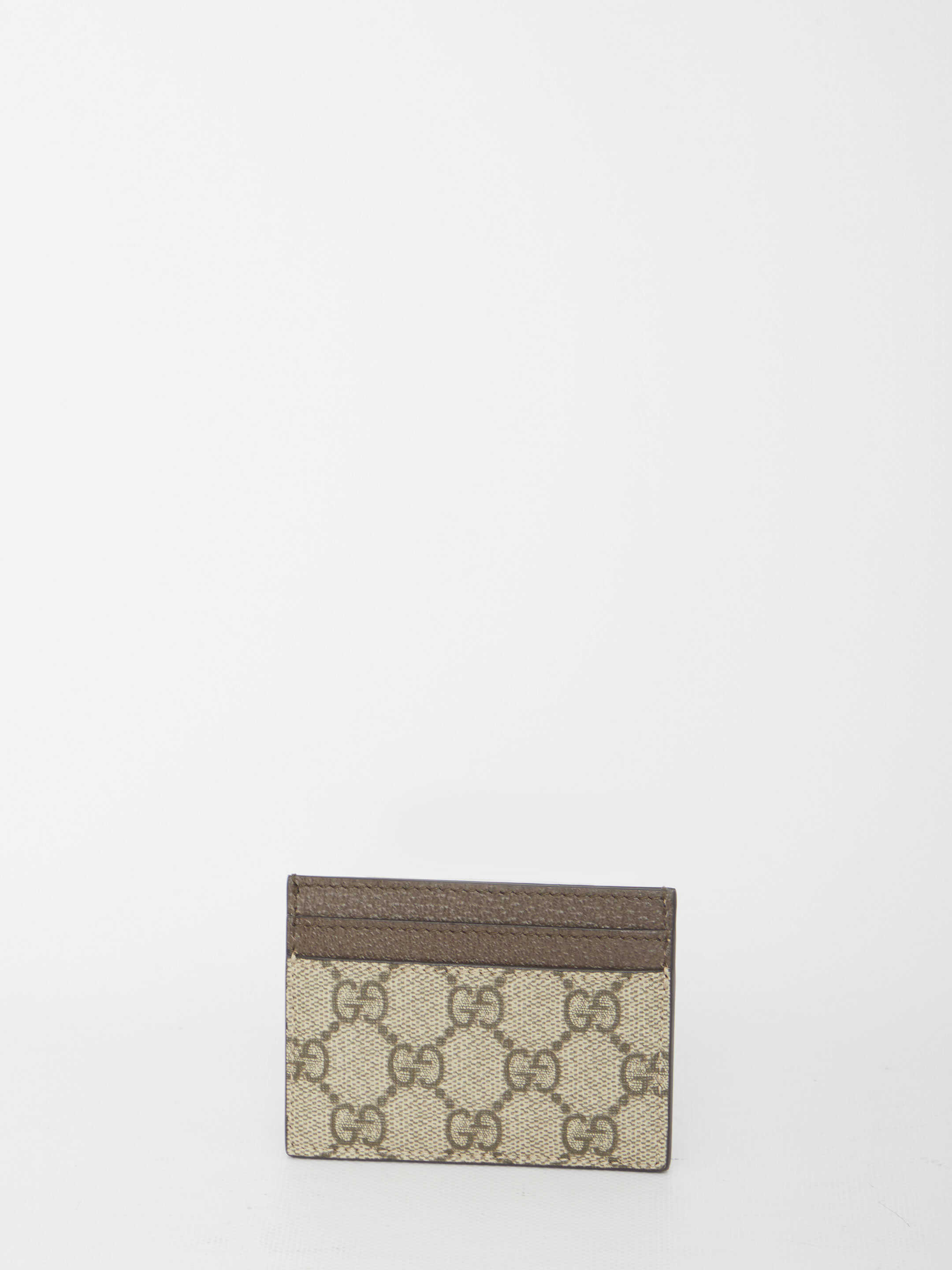 Ophidia cardholder in beige and ebony GG Supreme fabric with brown leather trims and green and red Web. Gold-tone metal Double G on the front. Four card slots and one top slip compartment.