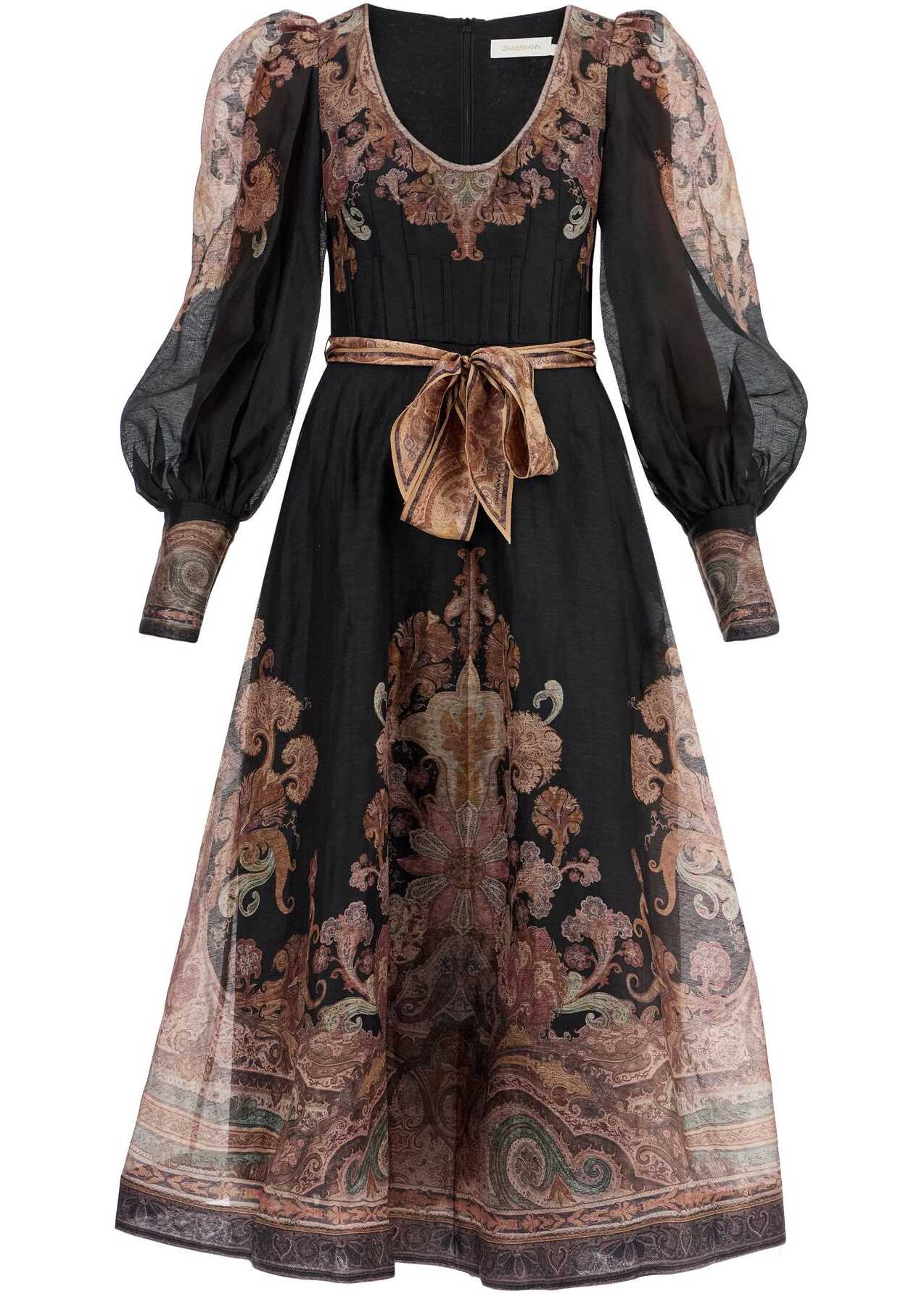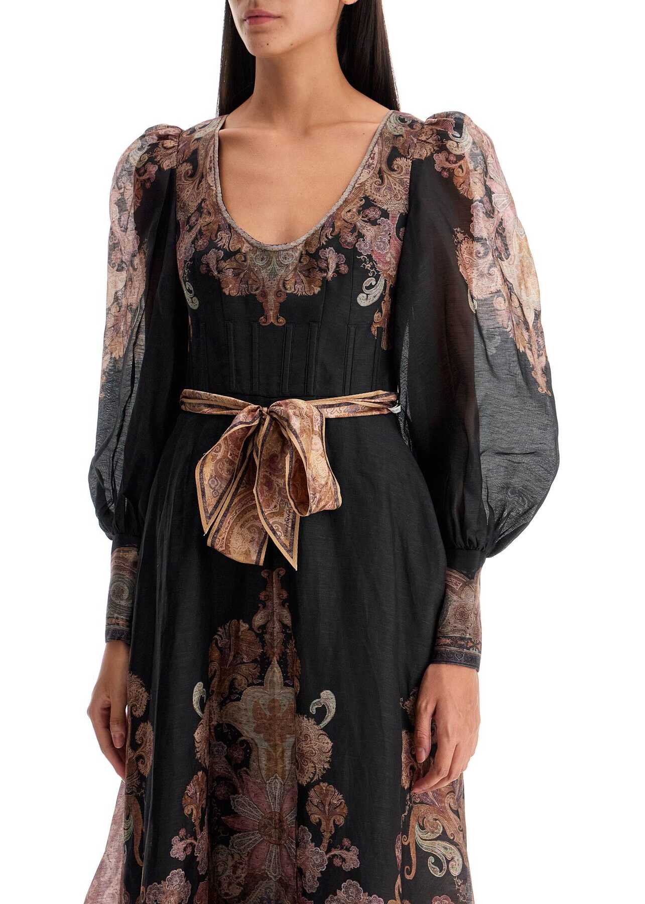 This midi dress by Zimmermann is made of linen and silk organza, featuring an all-over paisley print. The fitted bodice is framed by a deep structured neckline and waist with boning seams. The design is completed by billowy sleeves with high and narrow cuffs, a flared skirt, and a scarf belt to tie at the waist. Invisible zip closure at the back, fully lined skirt. The model is 177 cm tall and wears size 0.