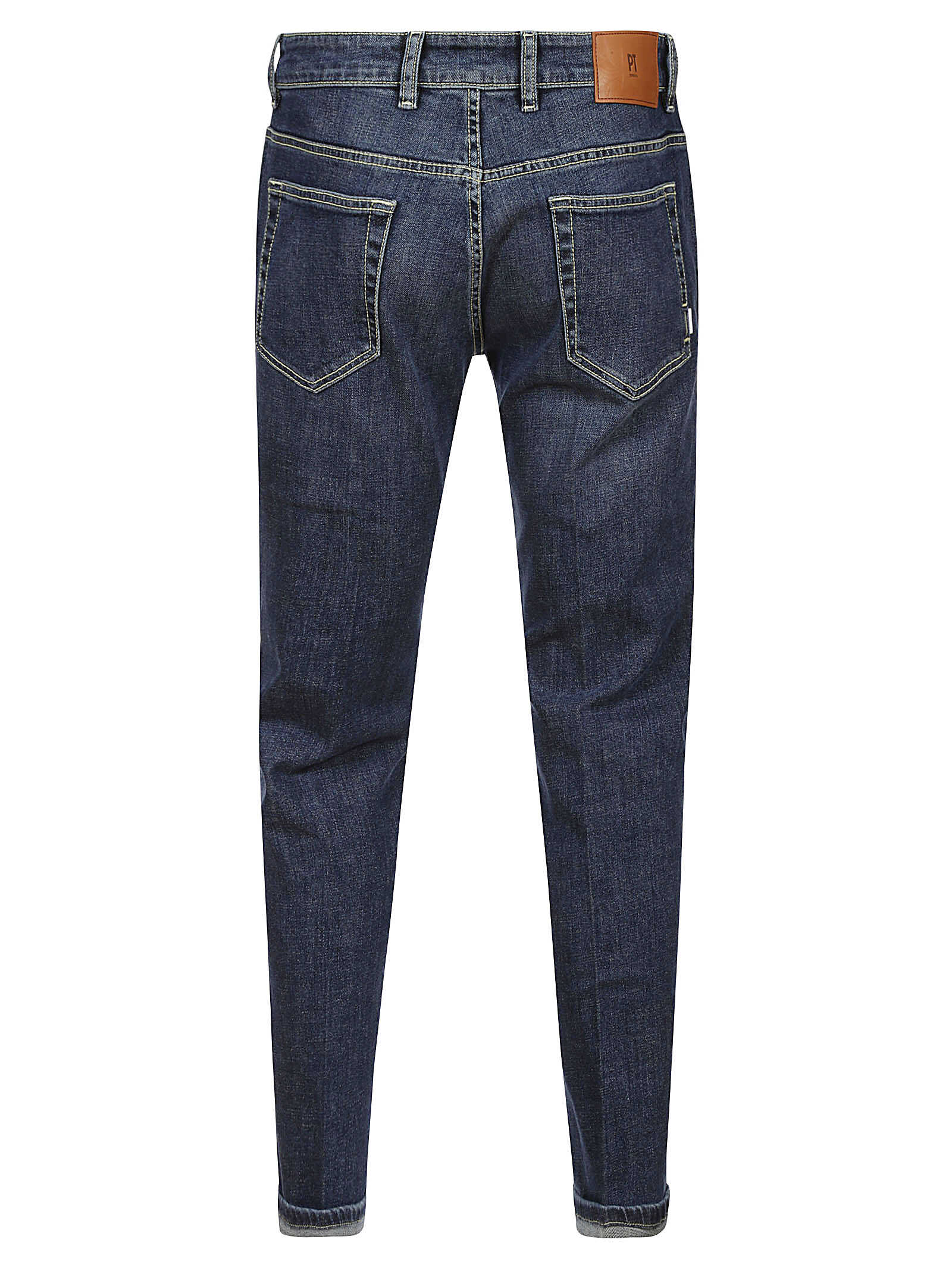 PT TORINO Blue denim, back logo application, worn effect on the thighs, faded effect, front closure with buttons and zip, belt loops, five pockets, regular slim.