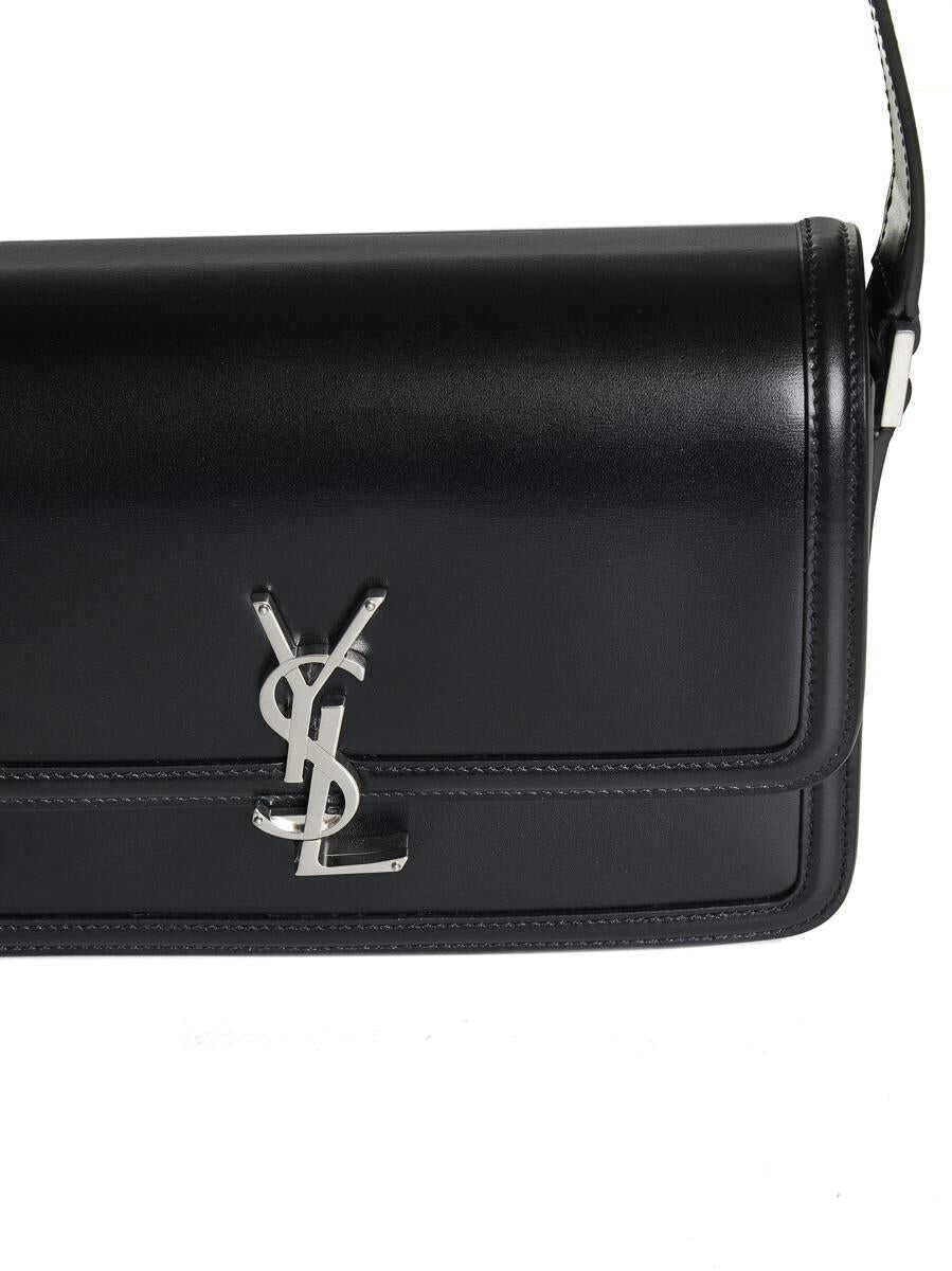 monogram-logo leather messenger bag from SAINT LAURENT featuring black, calf leather, monogram plaque, foldover top, clasp fastening, main compartment and adjustable shoulder strap.
