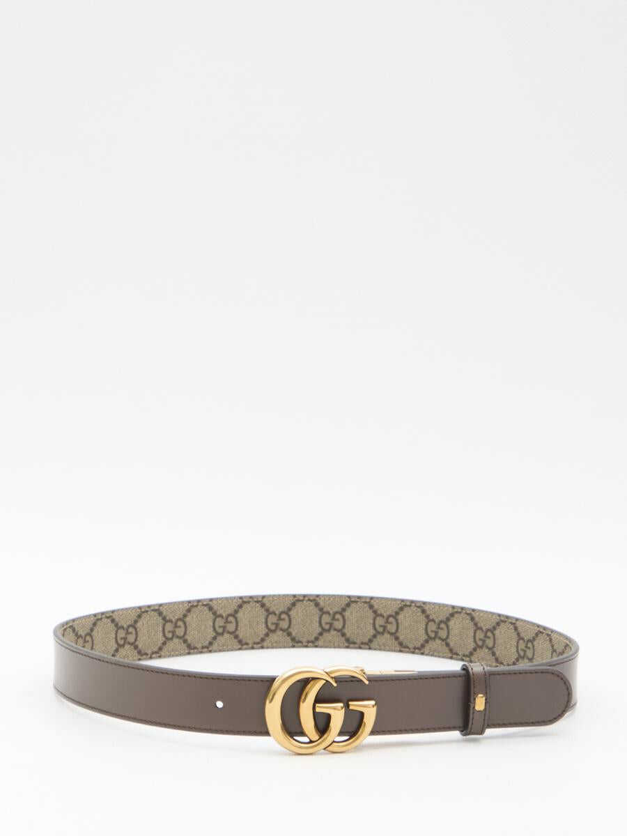 GG Marmont reversible belt in beige and ebony GG Supreme fabric on one side and brown leather on the other. It features Double G buckle in gold-tone metal. Adjustable design.
