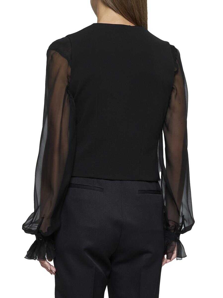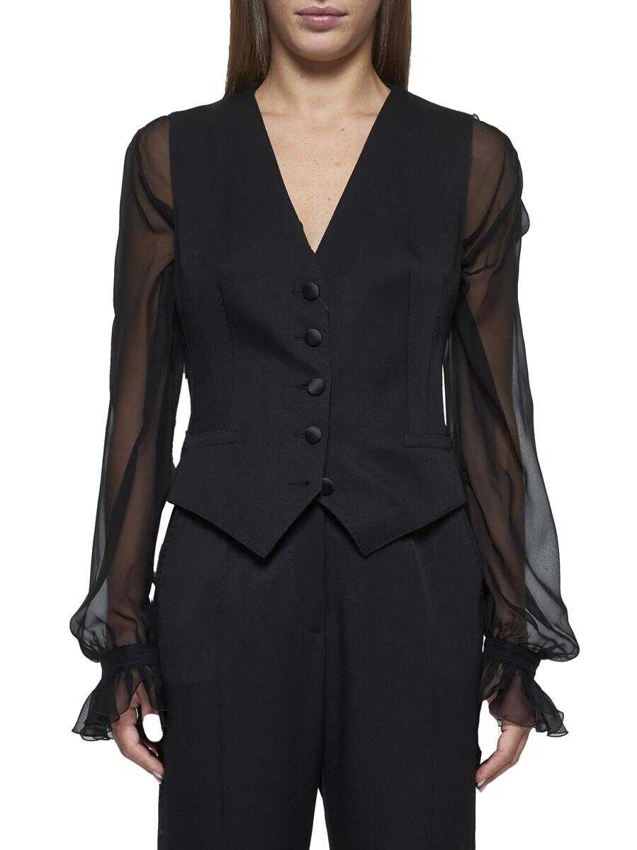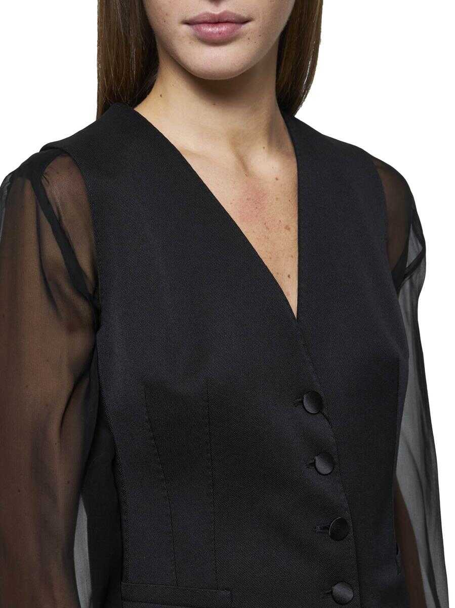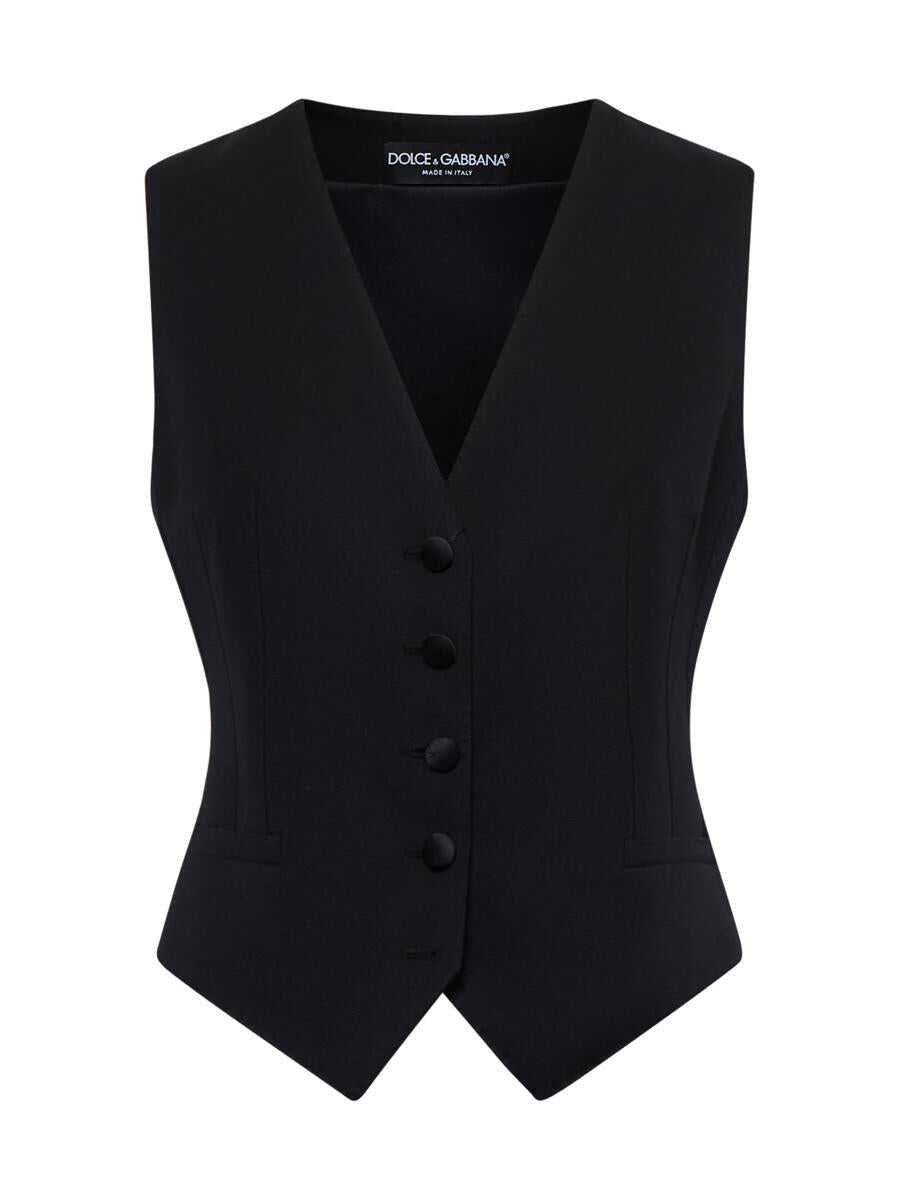 Dolce & Gabbana’s black virgin wool and viscose blend single-breasted waistcoat featuring a V-neck, satin-covered buttons and welt pockets.