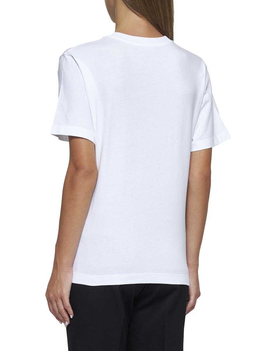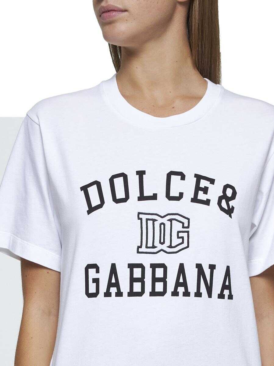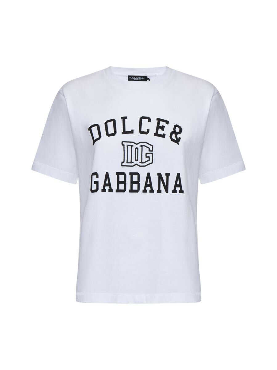 Dolce & Gabbana’s white cotton t-shirt featuring a crew neck, printed lettering logo + embroidered DG logo on the front.
