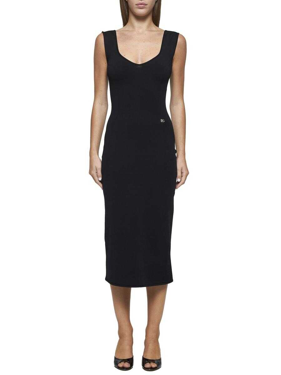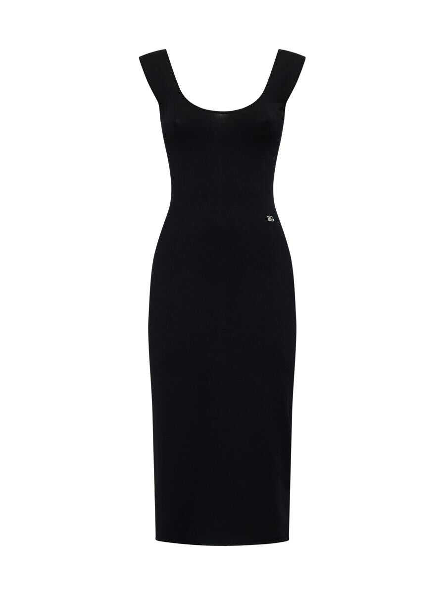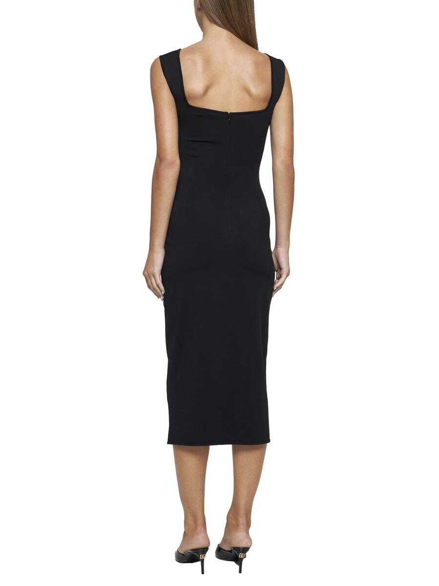 Dolce & Gabbana’s black viscose blend knit midi dress featuring a wide sweetheart neckline, fitted silhouette, DG logo plaque at the waist, square back neckline and zip and hook-and-eye fastening at centre back.