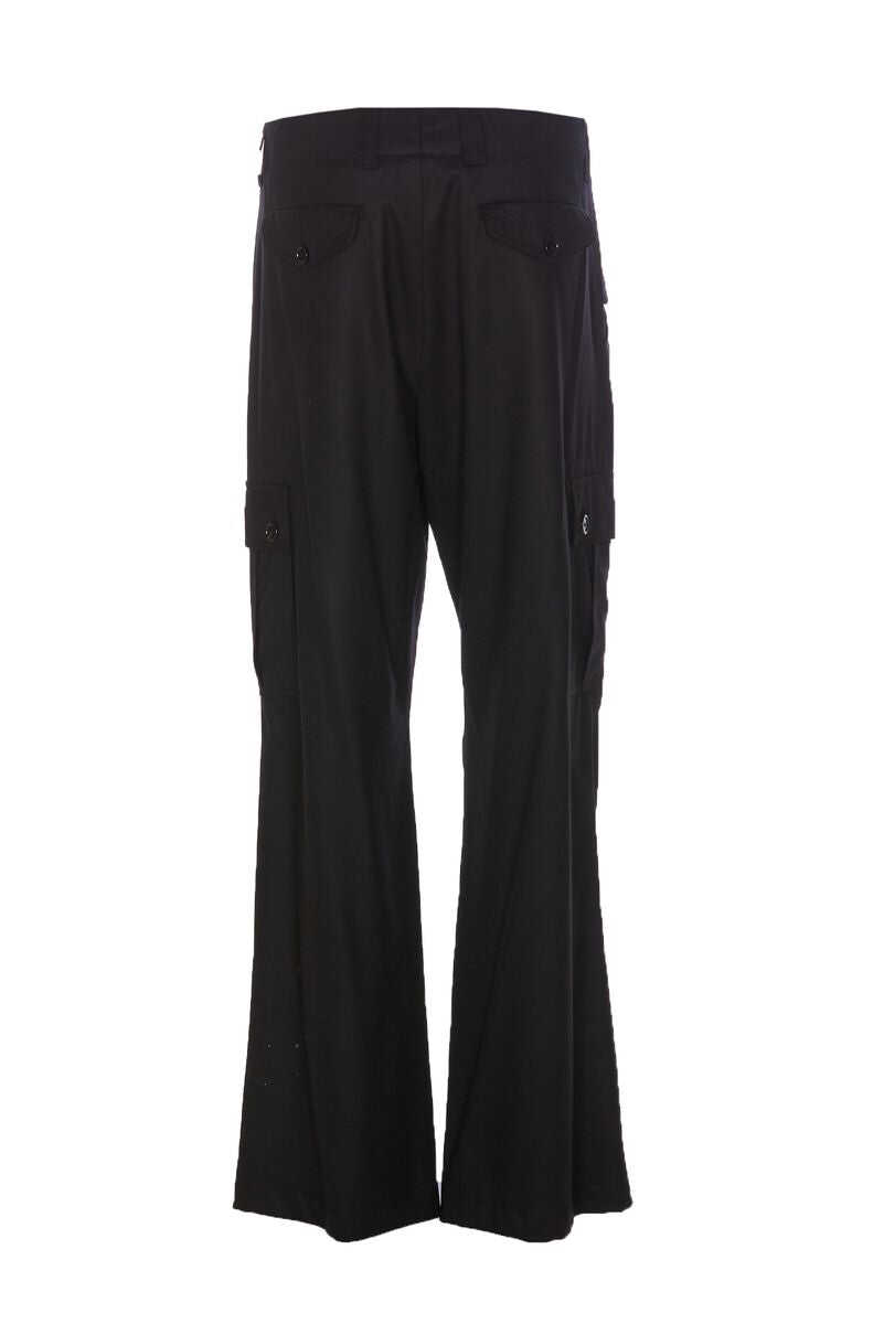 Dolce & Gabbana’s black virgin wool cargo trousers featuring belt loops, button and zip fly, side and back pockets with flaps and buttons, logo label on the right hip and flared leg.
