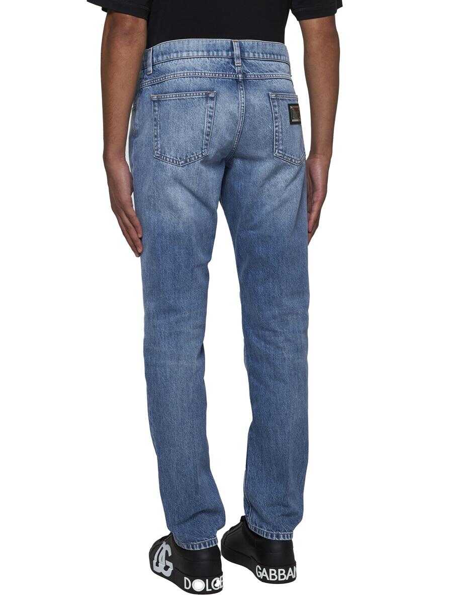 Dolce & Gabbana's faded light blue stretch denim regular-fit jeans featuring belt loops, button and zip fly, five-pocket cut, all-over rips, logo label on the front small pocket and logo plaque on the back pocket.