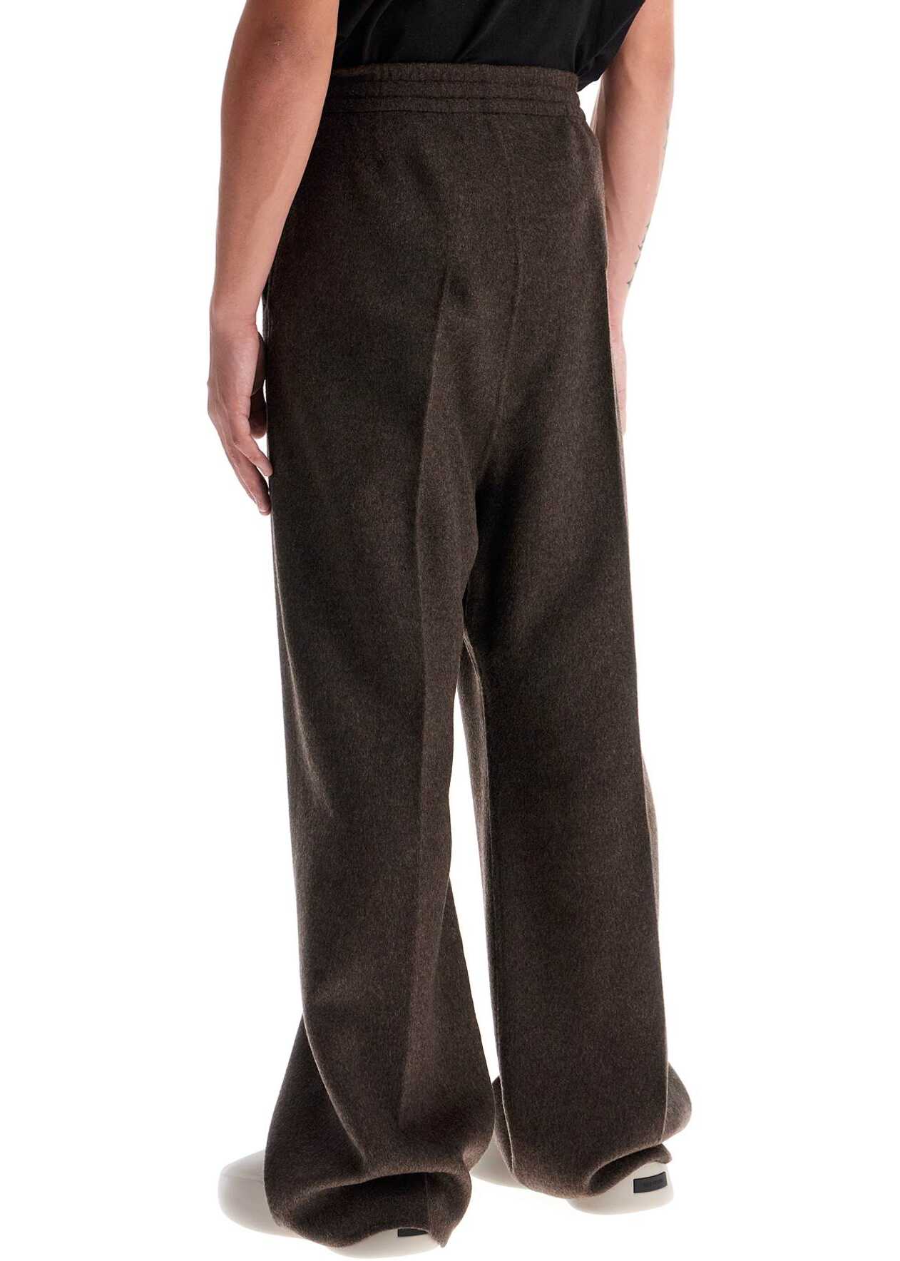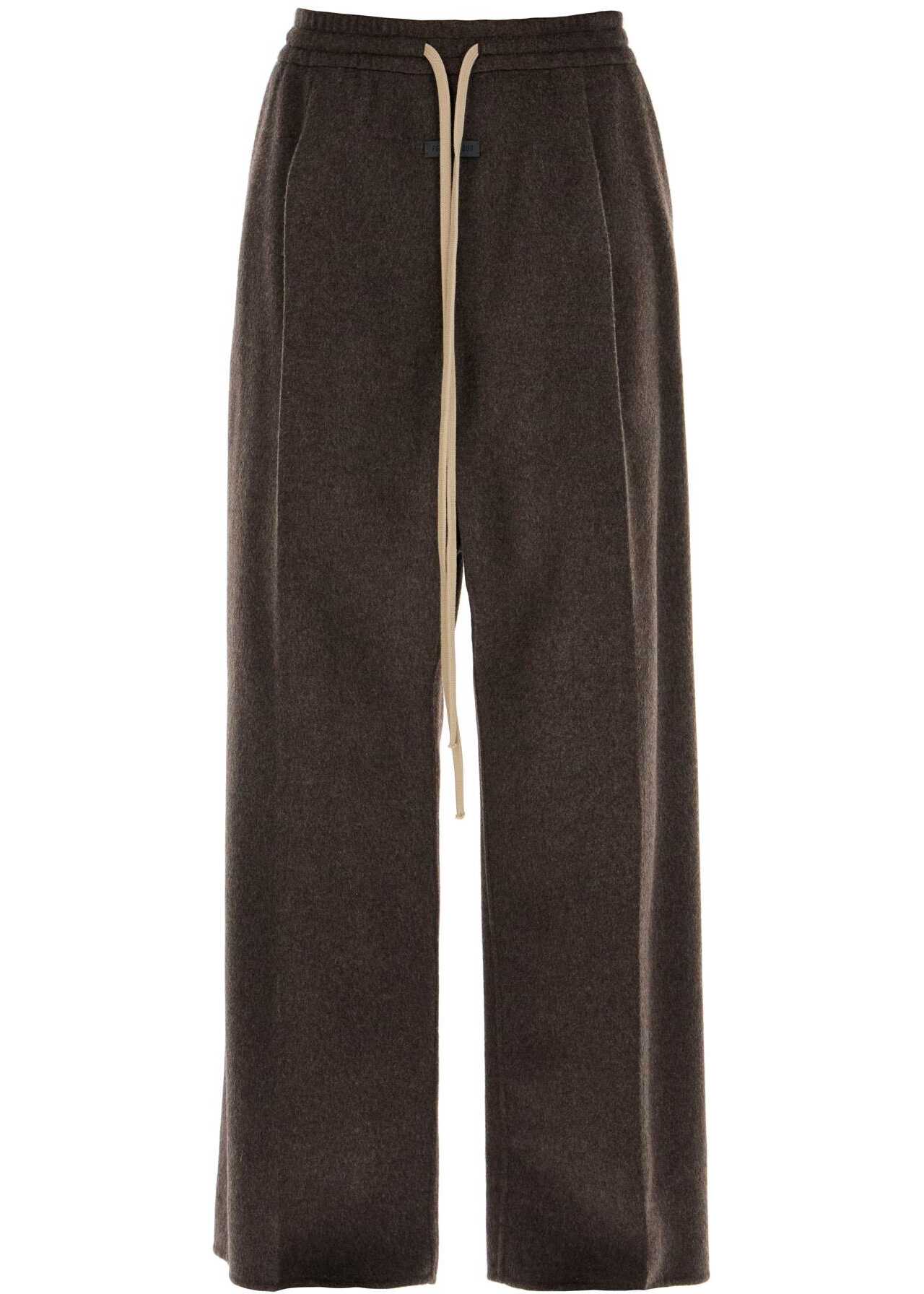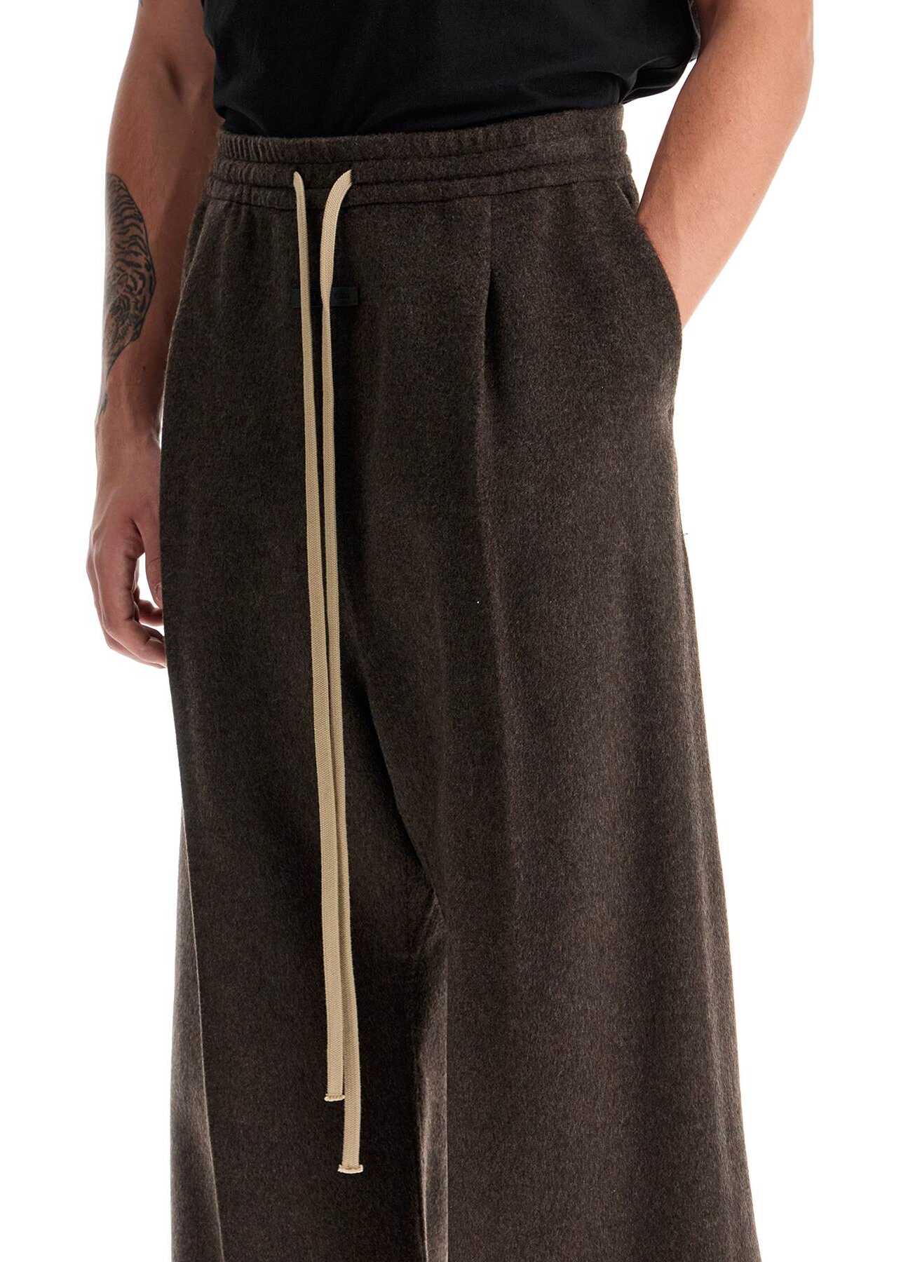 Fear Of God drawstring pants characterized by an oversized fit with a low crotch and front pleat. Made of soft brushed wool and cashmere fabric, they feature slanted pockets on the sides, an elasticated waistband, and a leather logo label on the front. The model is 182 cm tall and wears size L.