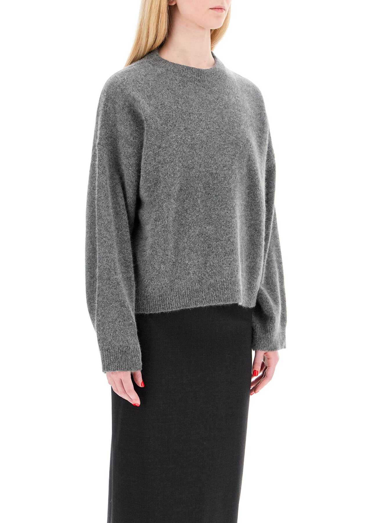 The Loulou Studio crew neck pullover has a wide and boxy fit with dropped shoulders, made from a soft blend of mercerized wool and yak. It features ribbed edges and reverse stitch details. The model is 177 cm tall and wears size XS.