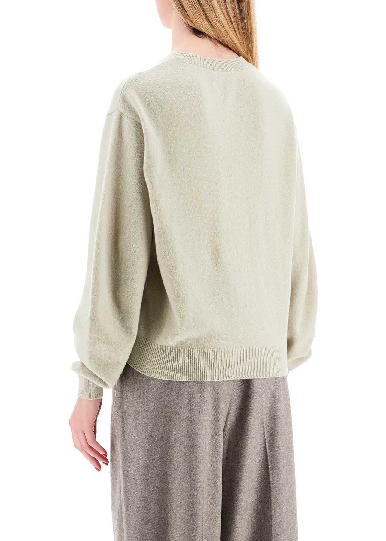 The MRZ crew neck pullover is made of wool and cashmere yarn, featuring a relaxed fit with dropped shoulders and ribbed edges. The model is 177 cm tall and wears size XS.