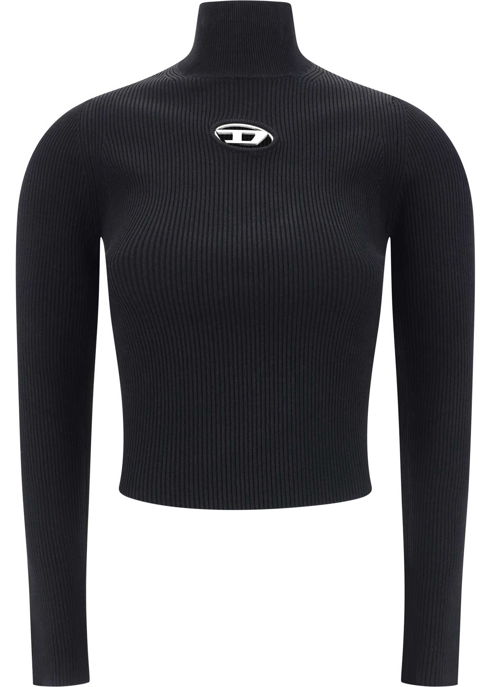M-Valari-tn Long Sleeve Top by Diesel, cropped style, all-over ribbed design, high neck, cut-out detail with iconic three-dimensional brand logo plaque, monochrome pattern, slim fit.