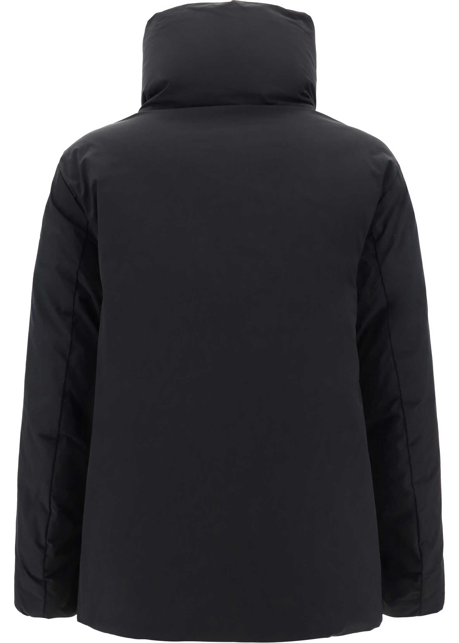 Luxury Cocoon Down Jacket by Woolrich, high collar, front zipper and snap button closure, two side welt pockets, elastic ribbed cuffs, adjustable drawstring hem, all-over quilted and padded design, monochrome pattern, regular fit.
