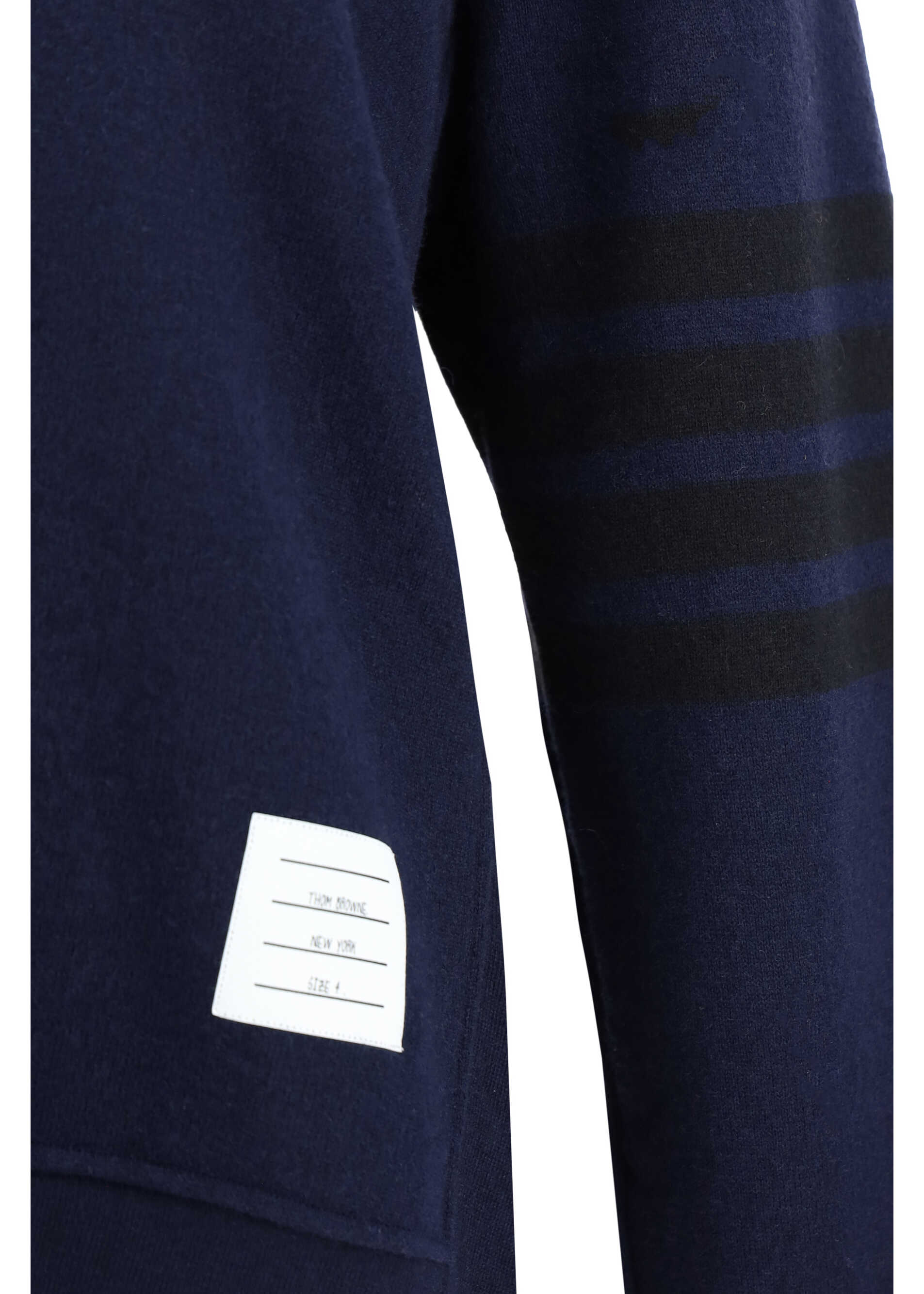 Virgin Wool Turtleneck Sweater by Thom Browne, ribbed high neck, front button closure, iconic white bands on left sleeve, ribbed cuffs, ribbed hem, patch with iconic brand monogram applique on front, monochrome pattern, regular fit.