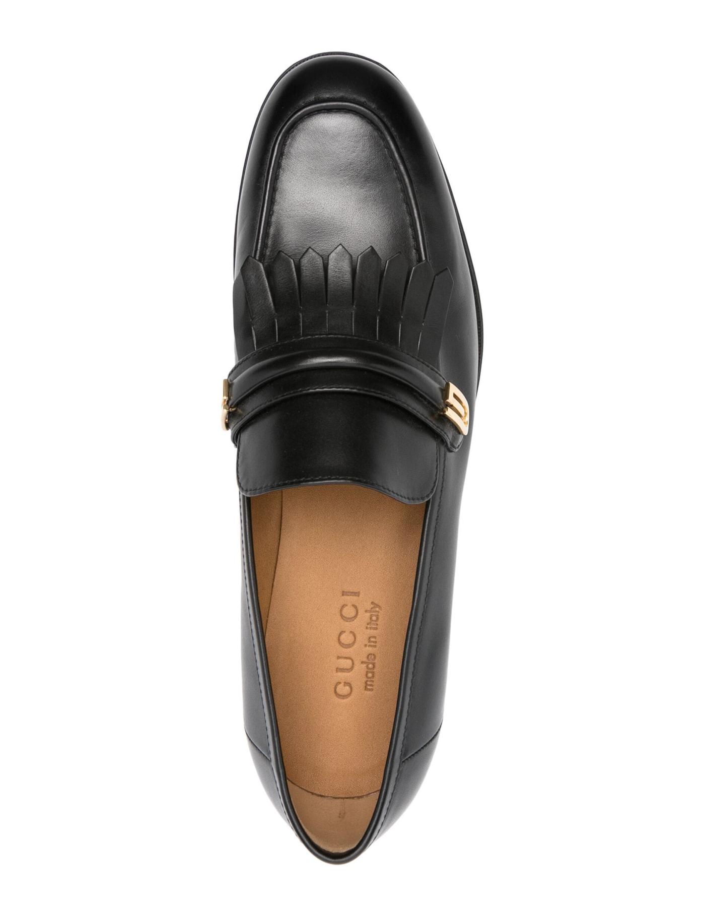 The classic loafer is a signature silhouette for Gucci and this fringed pair is dressed in smooth black leather for SS23. Detailed with fringing across the toe, the stylish pair is adorned with mirrored G logo accents in complimentary gold-tone hardware.