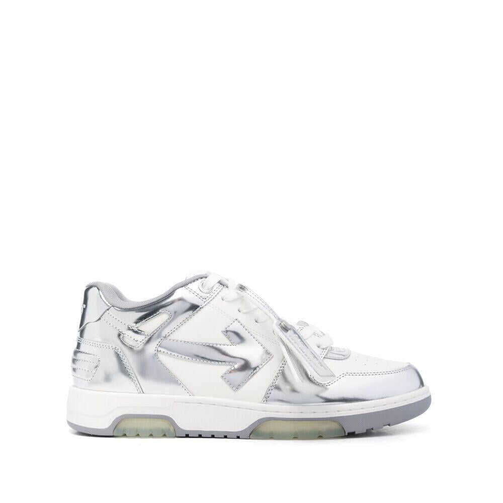 White/silver-tone calf leather metallic-effect panelling colour-block panelled design front lace-up fastening branded heel counter padded ankle text-debossed tongue signature arrows motif signature zip tie tag perforated toebox round toe branded insole mesh lining flat rubber sole this piece comes complete with a protective dust bag.