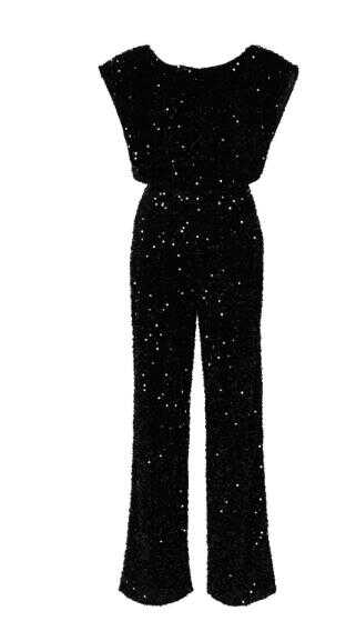 black sequin design rear button and zip fastening boat neck sleeveless two diagonal pockets to the sides cut-out detailing to the rear straight leg