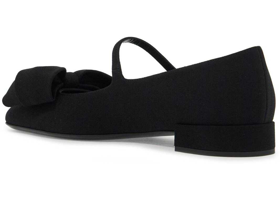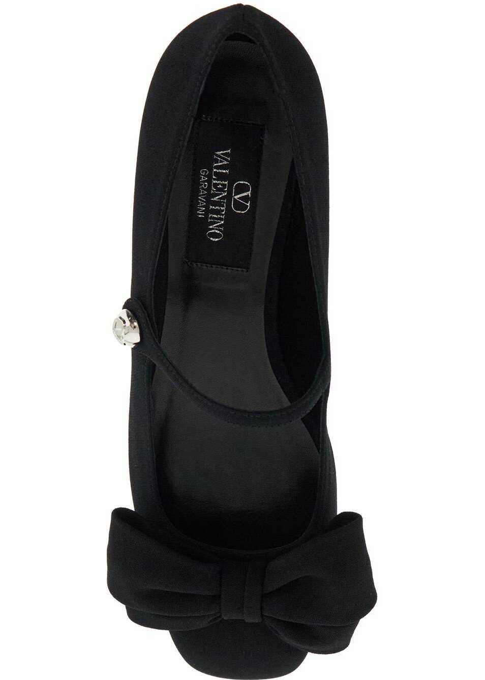 Valentino Garavani's Bowjane ballerina flats are made of silk crepe and adorned with a large bow on the toe. They feature an elastic strap with a decorative button, leather lining, and a leather sole.