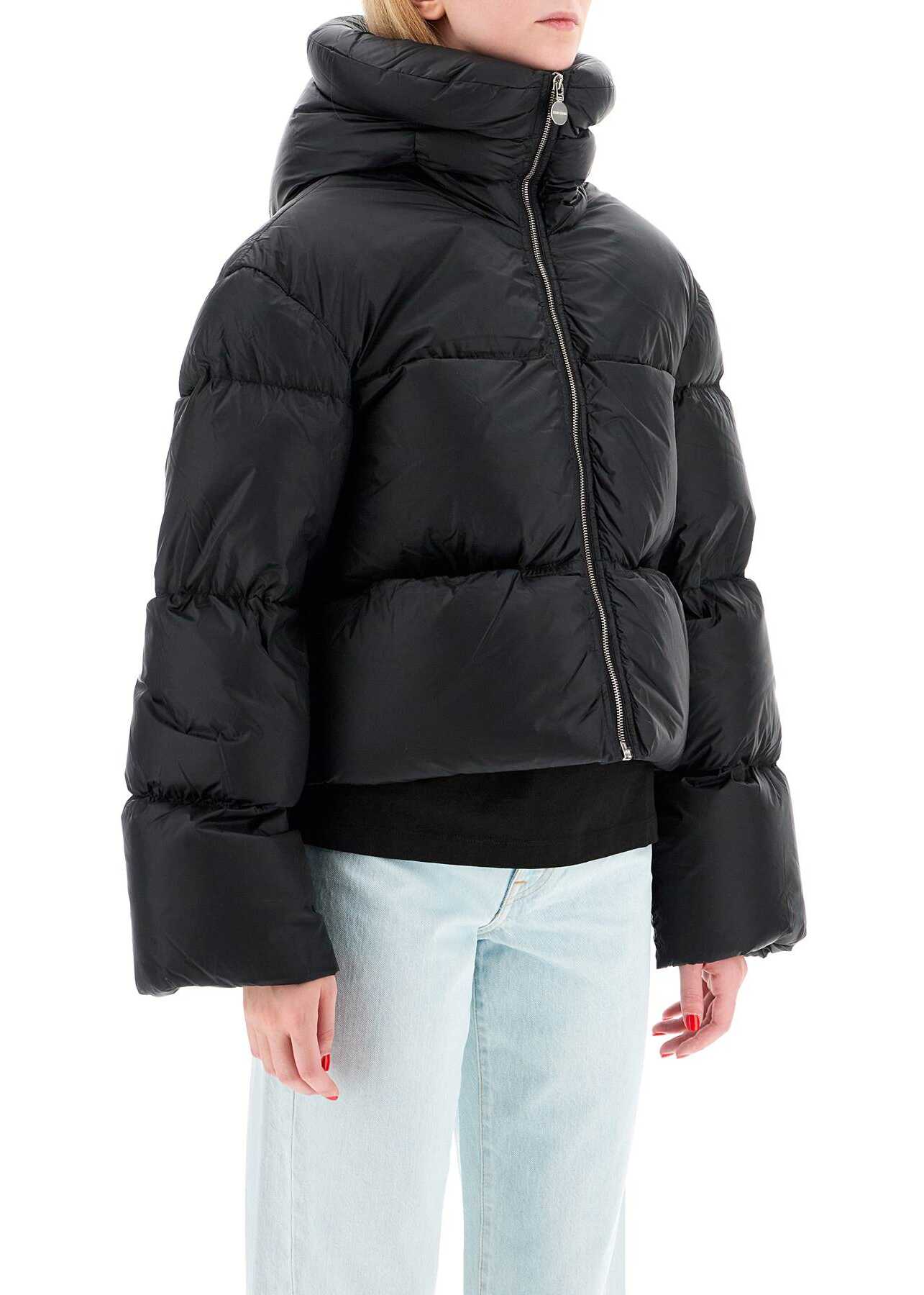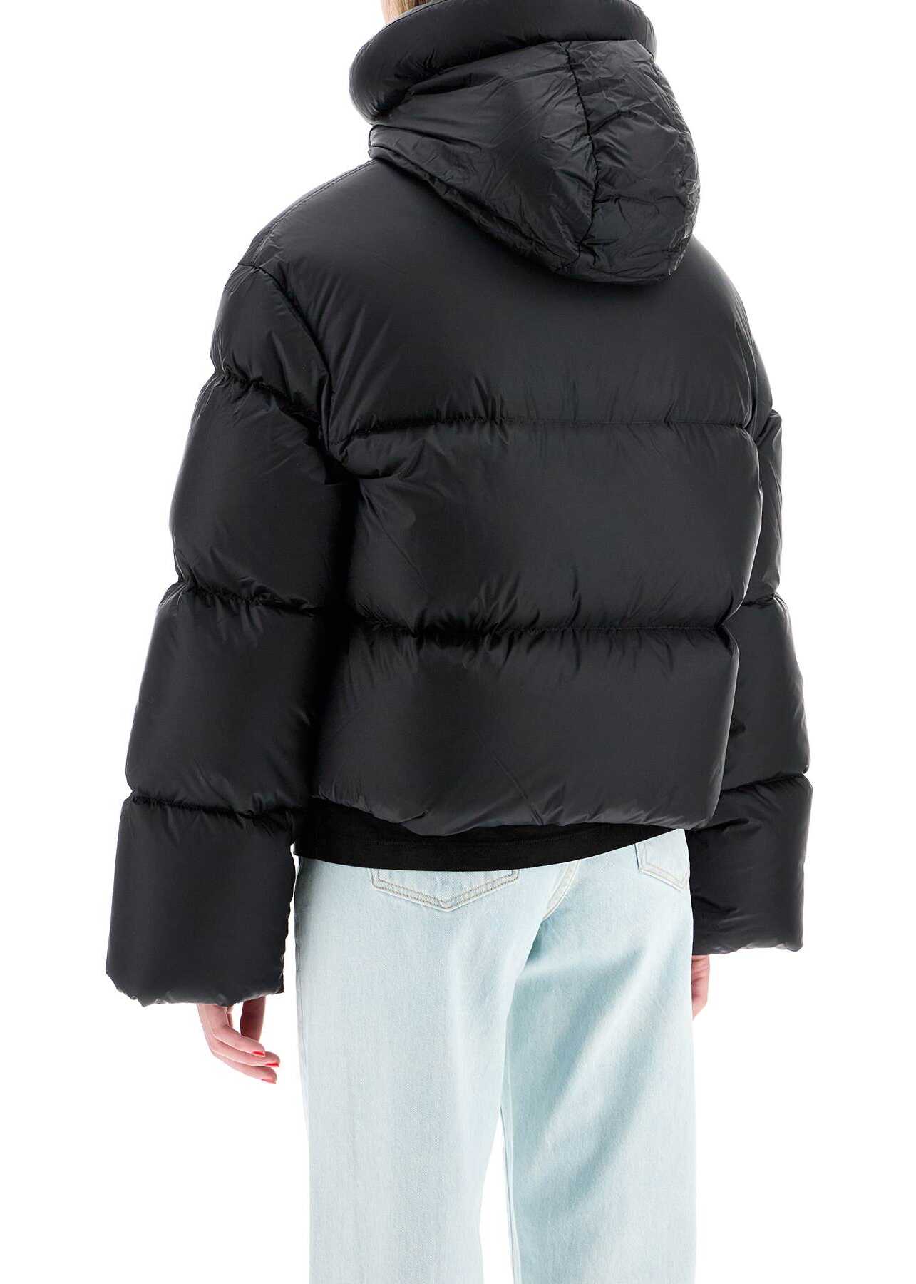 Short down-filled quilted jacket in nylon by Ienki Ienki. Boxy-fit style featuring high neck with integrated hood, zip closure, internal elasticated windproof cuffs, two front pockets and adjustable hem with elastic drawstring. The model is 177 cm tall and wears size XS.