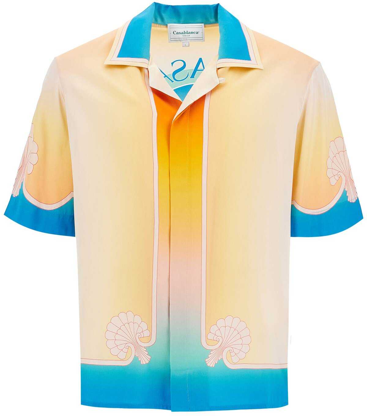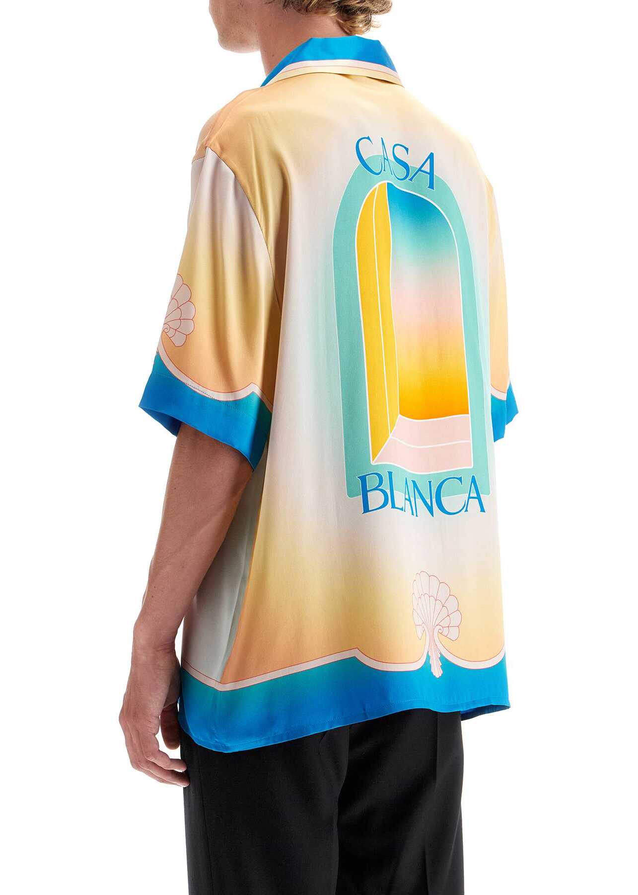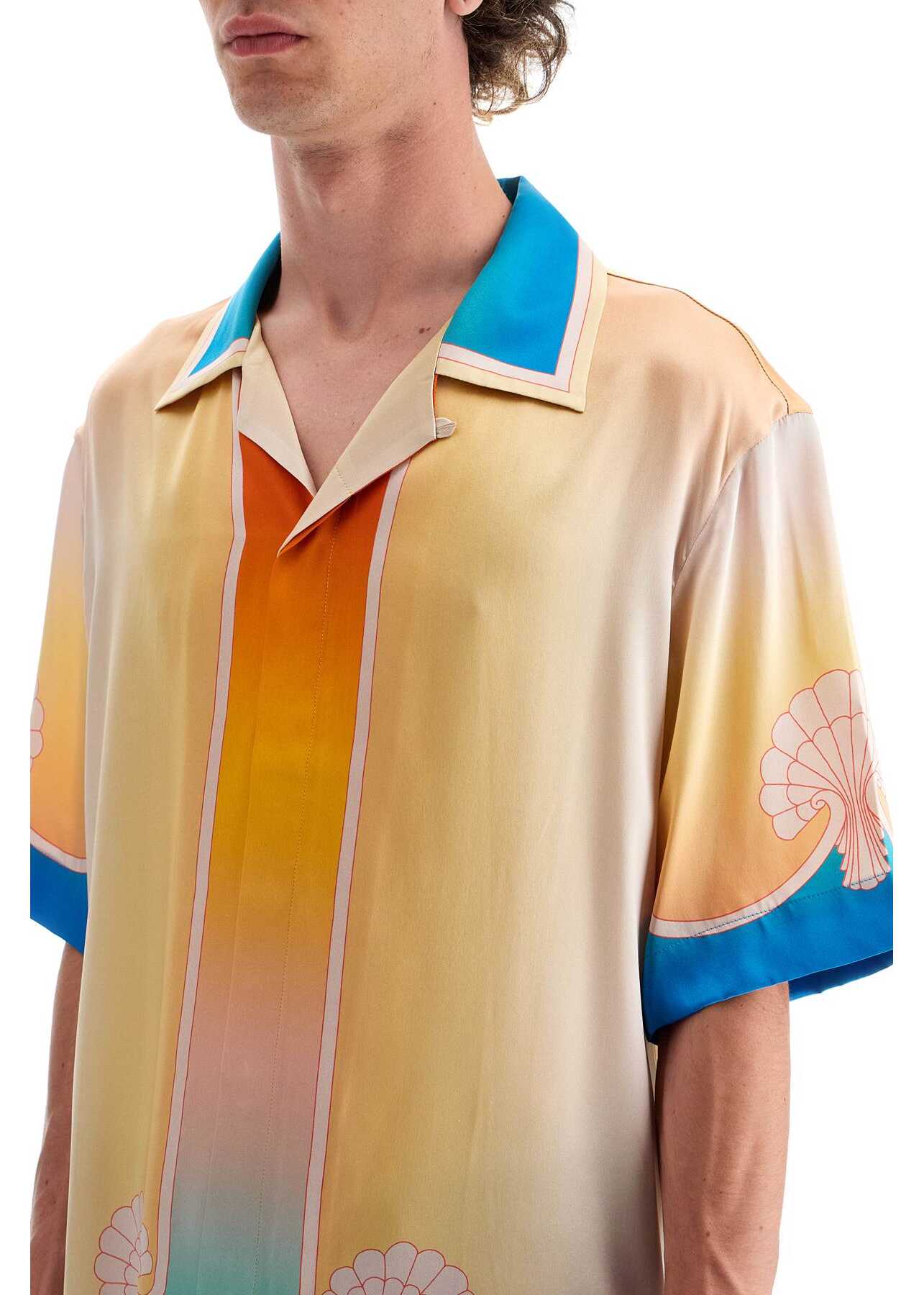 The Casablanca short-sleeved shirt is made of pure silk satin with an all-over "L'Arc Coloré" print. It has a boxy cut, completed by a Cuban collar and hidden button closure. The model is 187 cm tall and wears size L.