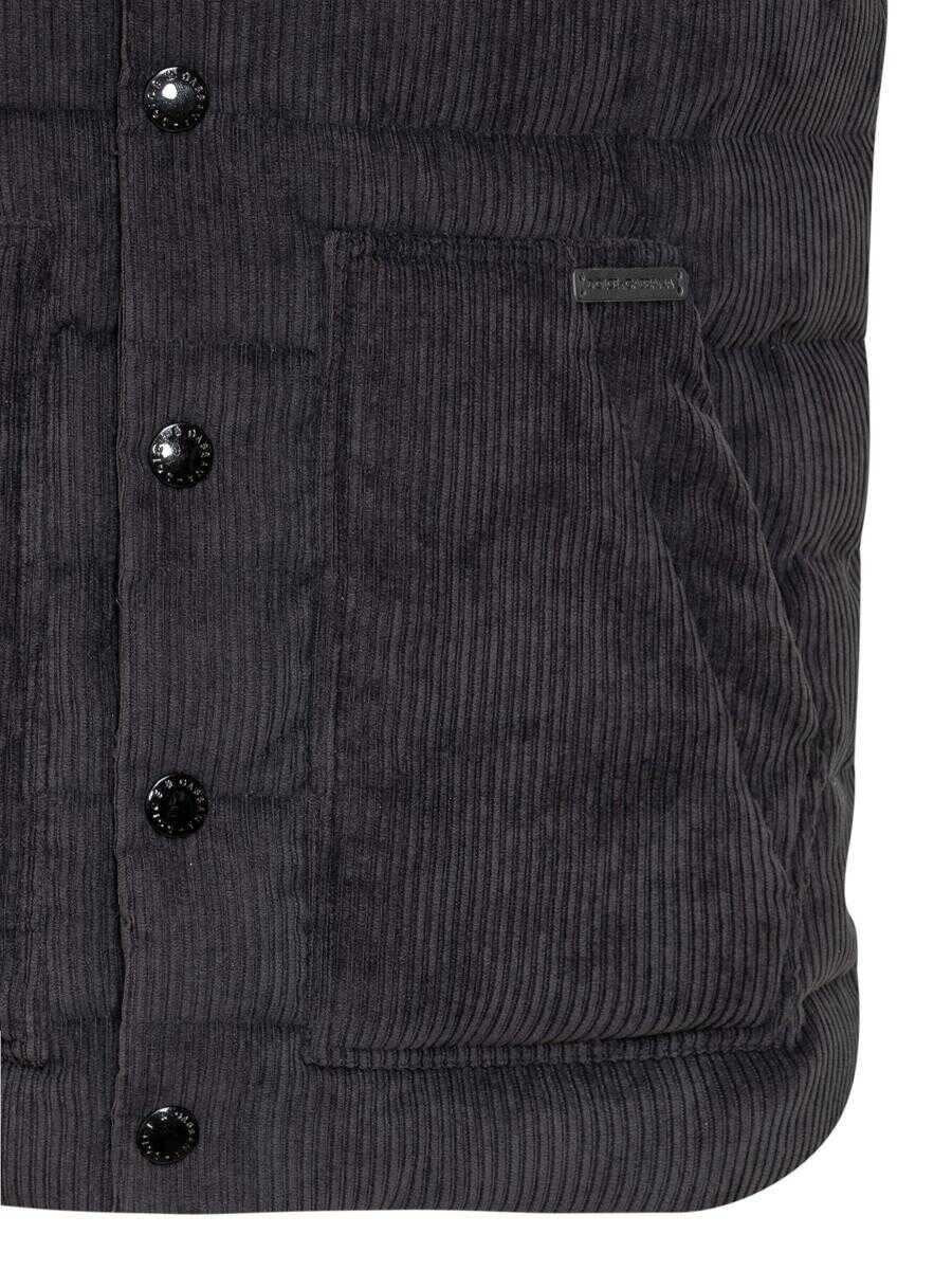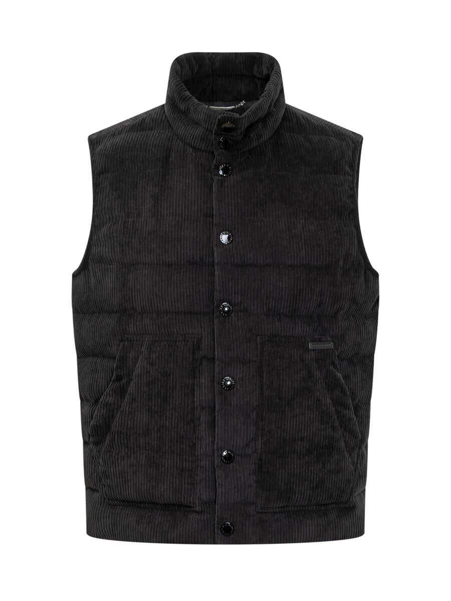Padded sleeveless vest. High collar. Button closure. Two side pockets. Logo on front.