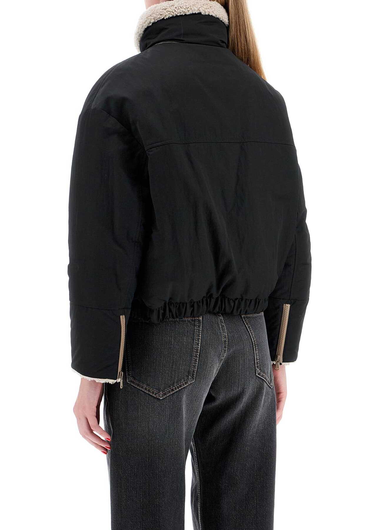 This short Brunello Cucinelli down jacket is made of water-repellent satin with shearling inserts on the collar and cuffs. It features a two-way zip closure and a chin strap, slit pockets with zippers, an elasticized bottom with drawstring, and ribbed knit inserts on the cuffs. Adorned with a precious jewel on the back of the neck, it has a regular fit. The model is 177 cm tall and wears size IT 40.