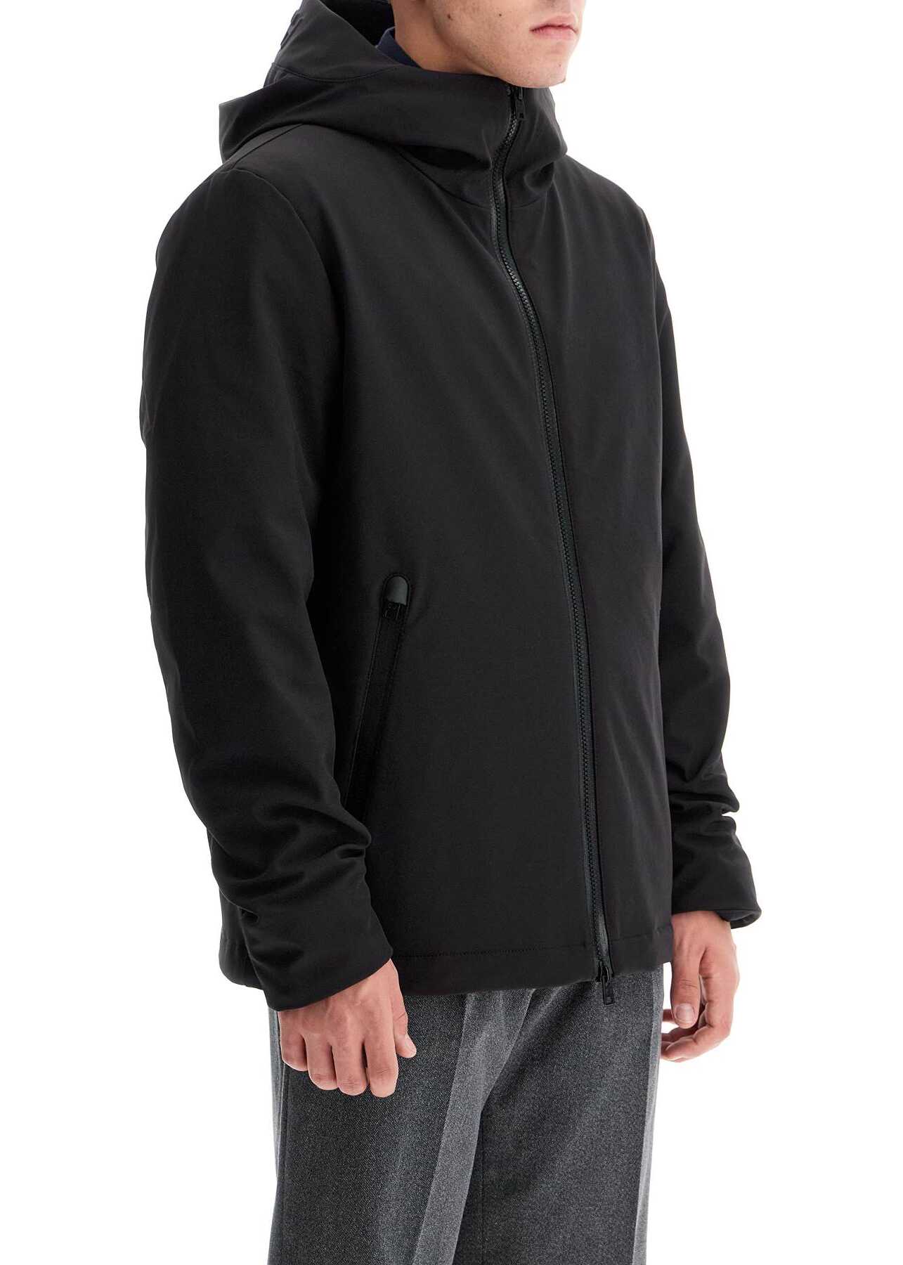 The Woolrich hooded jacket is made of softshell fabric with a light feather padding. It features a two-way zip closure, internal windproof cuffs, side pockets with zips, and an adjustable hem. The interior is quilted nylon with a small pocket. Regular fit. The model is 182 cm tall and wears size L.