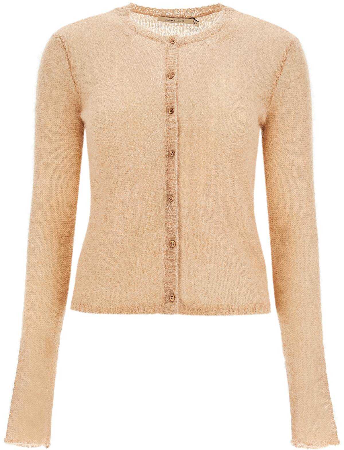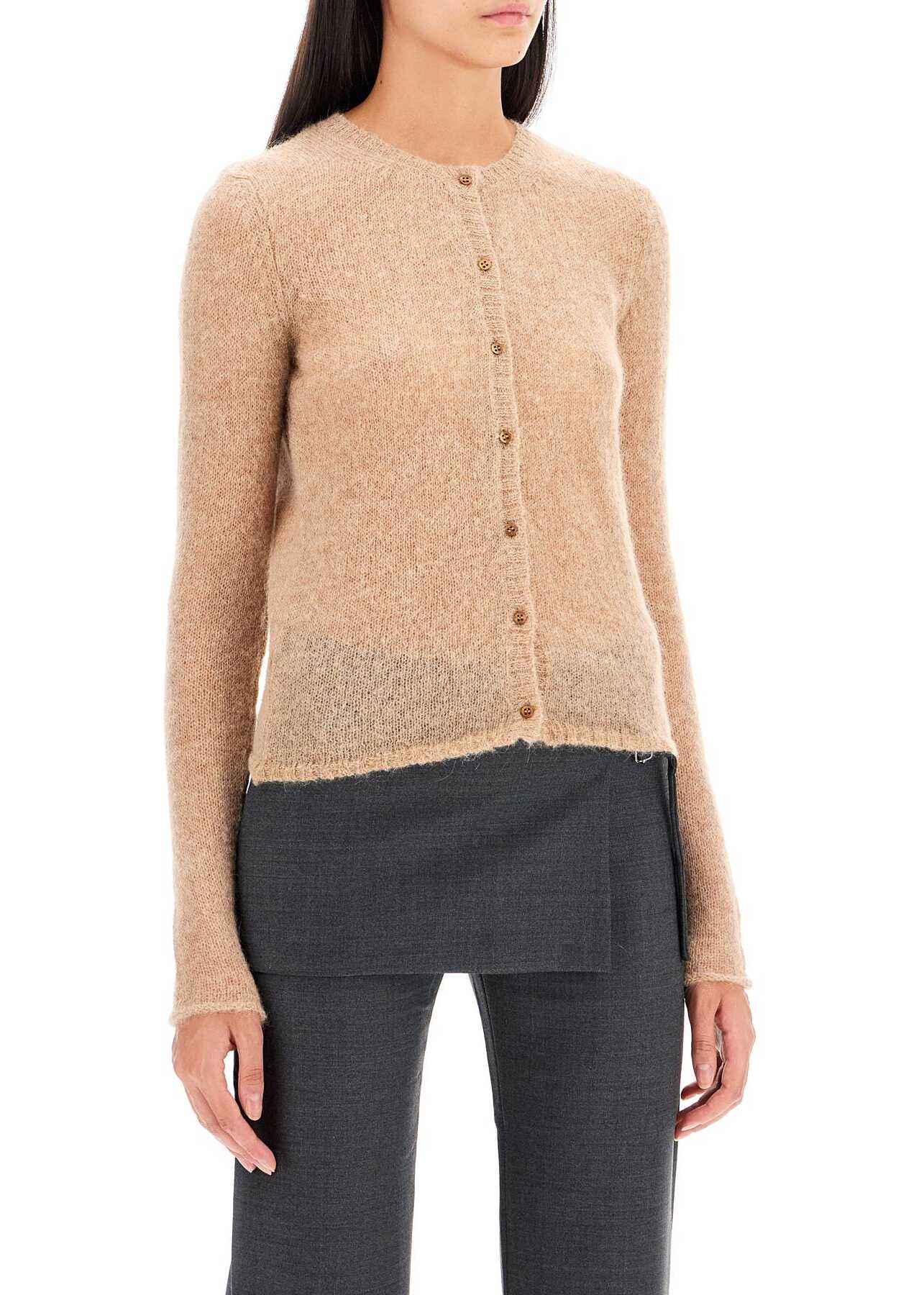 The Cardigan Button Alone by Paloma Wool is made from a blend of alpaca and mohair yarns sourced from responsible farms. It features the "Avec Palisir" lettering inlaid on the back, a round neckline, ribbed edges, and a slim fit. The model is 177 cm tall and wears size XS.