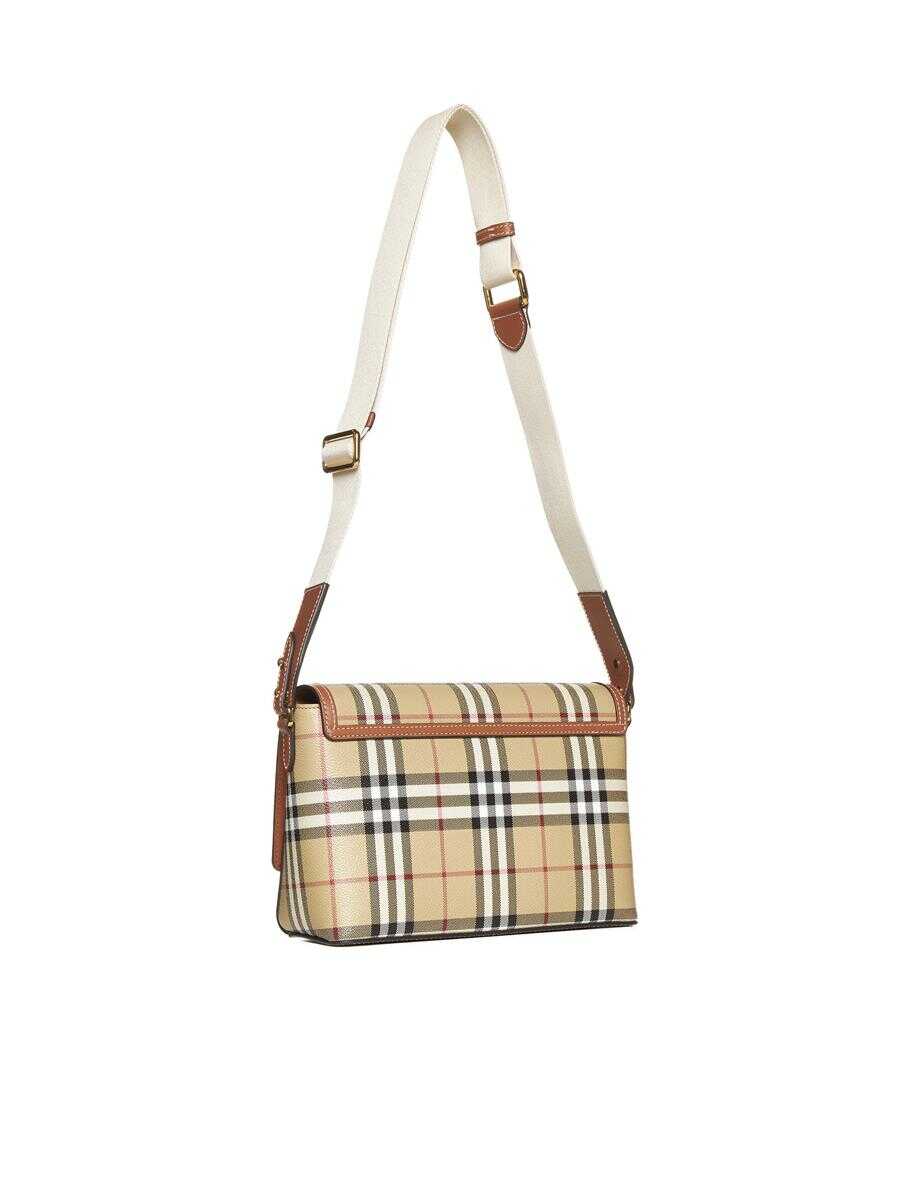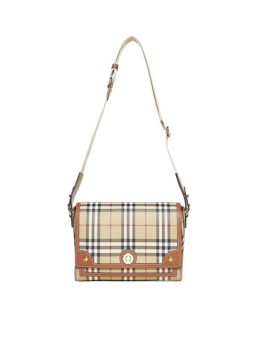 Burberry’s Note medium bag in beige check waxed canvas and tan leather featuring an adjustable fabric strap, flat studs with logo embossed on the flap, concealed magnetic fastening, internal flat pockets and gold-tone metal hardware.