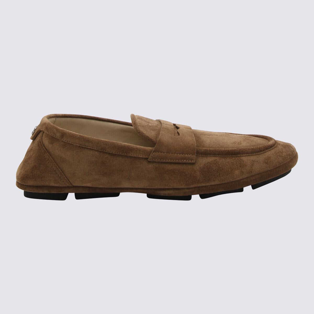 Brown suede loafers from Dolce & Gabbana featuring almond toe, branded insole, slip-on style, logo plaque at the heel and flat rubber sole.
