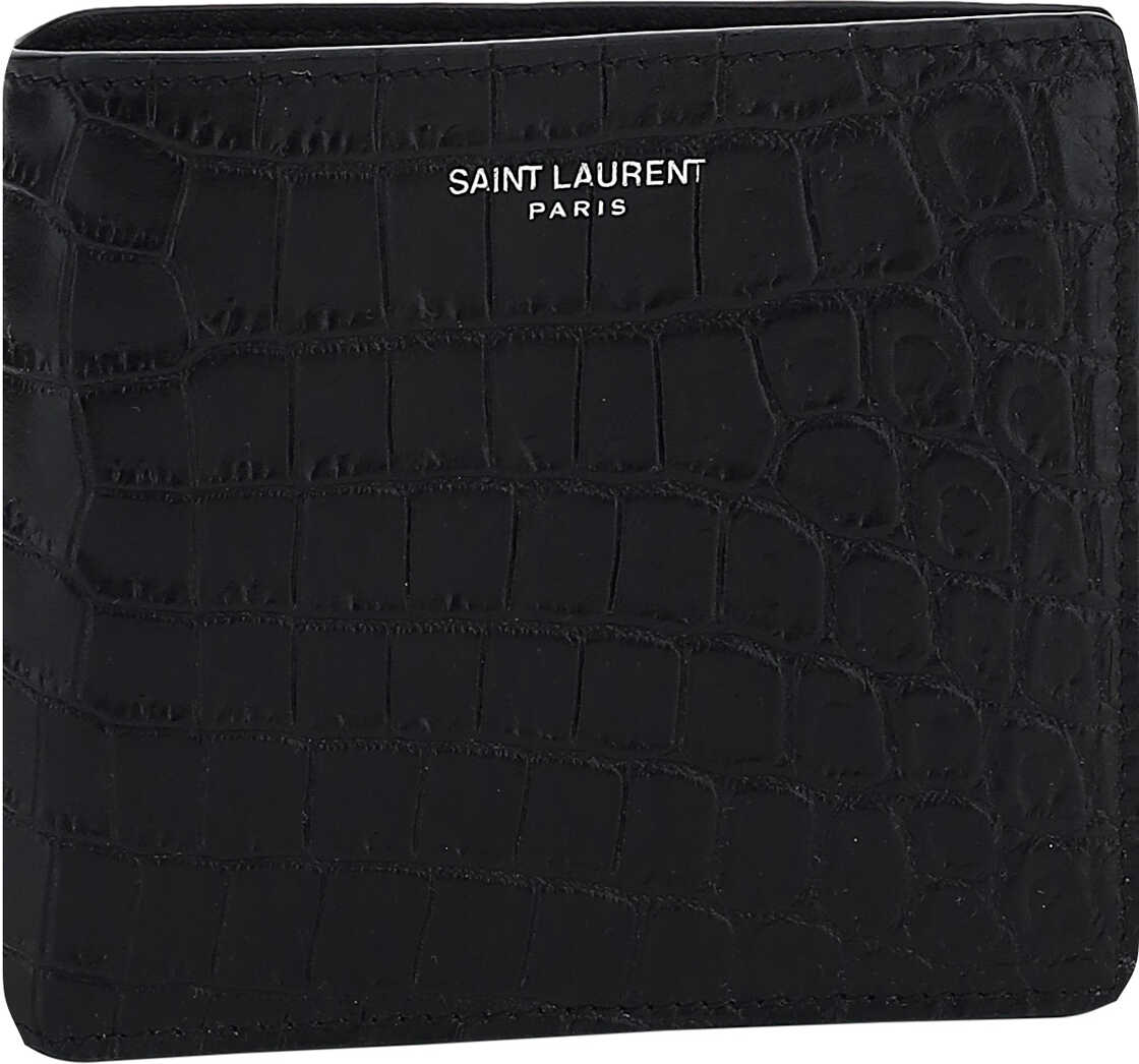 Calfskin Wallet by Saint Laurent, billfold design, plaque with iconic brand monogram embossed on front, card slot, bill slot.