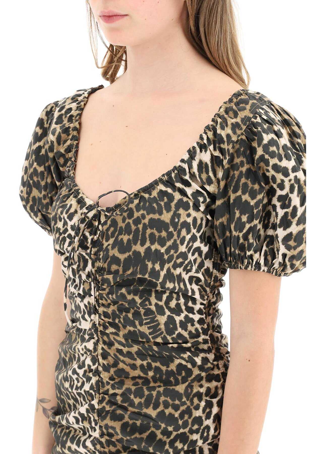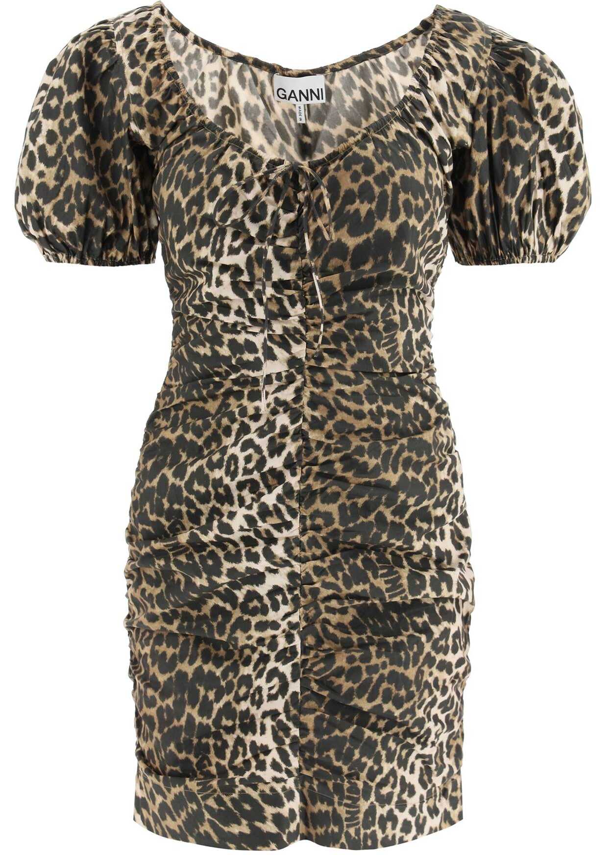 Ganni mini dress in organic cotton poplin with animalier print, featuring a gathered design with a round neckline with drawstring and short balloon sleeves with elasticted hem. Finished with invisible side zipper closure. Slim fit. The model is 177 cm tall and wears a size EU 34.