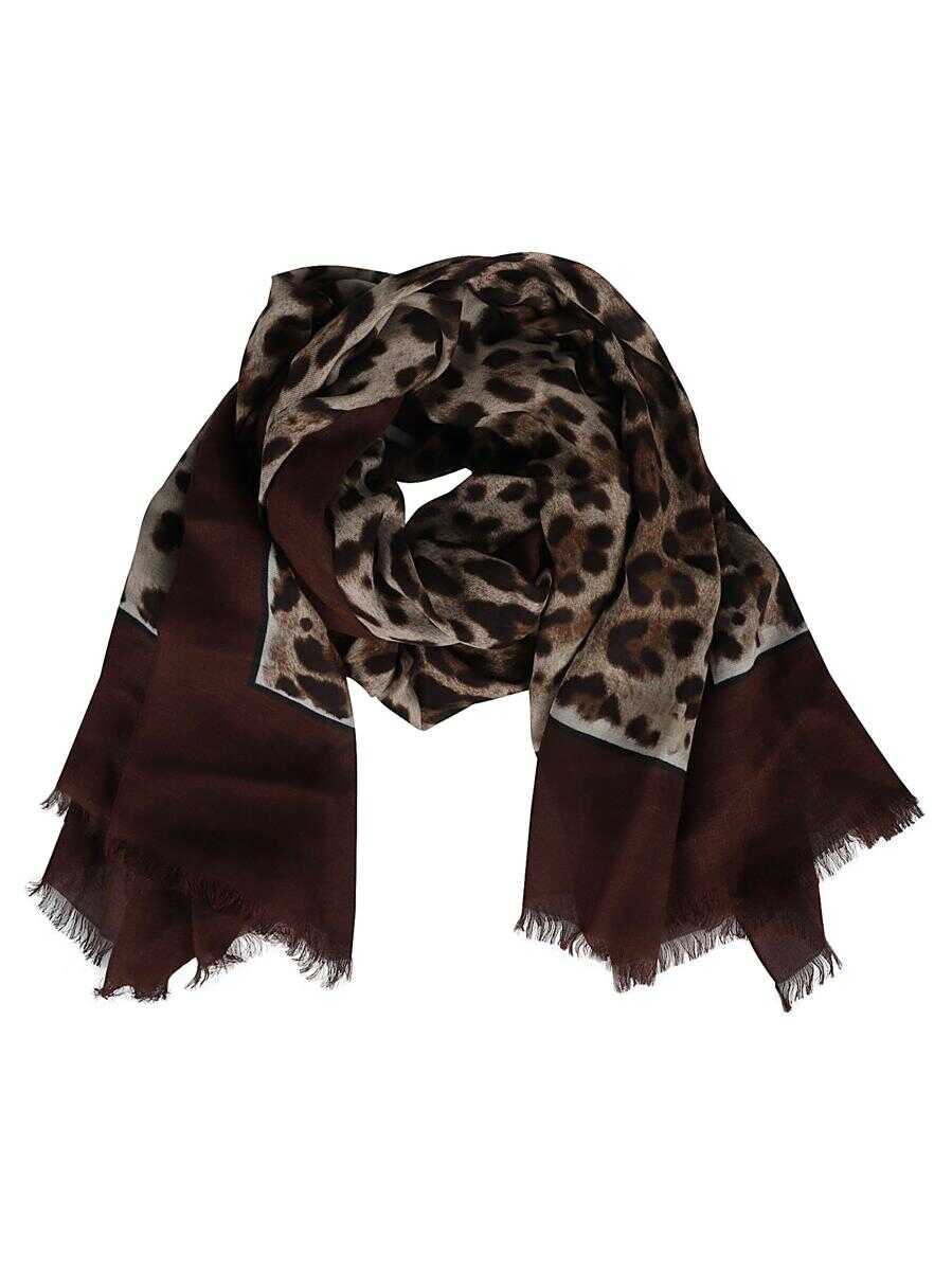 leopard-print silk scarf from DOLCE & GABBANA featuring chocolate brown, multicolour, leopard print, logo print at the hem, square shape, solid border and frayed edge. This item contains at least 50% materials which are certified or widely recognised as having a lower environmental impact through production and/or manufacturing processes that reduce water consumption and the use of harmful chemicals, or re-use by-products of the production process.. Learn more about what makes a product Conscious on our Conscious Criteria page.
