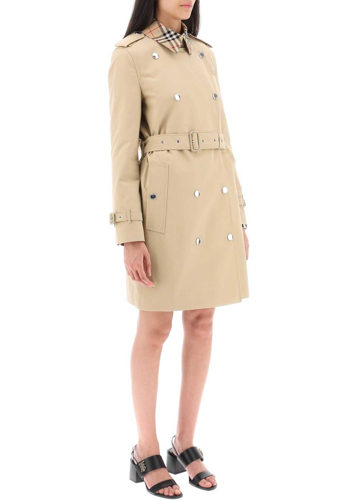 Burberry midi trench coat made from bespoke cotton gabardine with Burberry Check collar and lining. Cinched at the waist with a matching belt, it features a double-breasted snap fastening with a hook-and-eye at the collar, epaulettes, belted cuffs, studded side welt pockets, and a storm shield at the back. Regular fit. The model is 177 cm tall and wears a size UK 6.