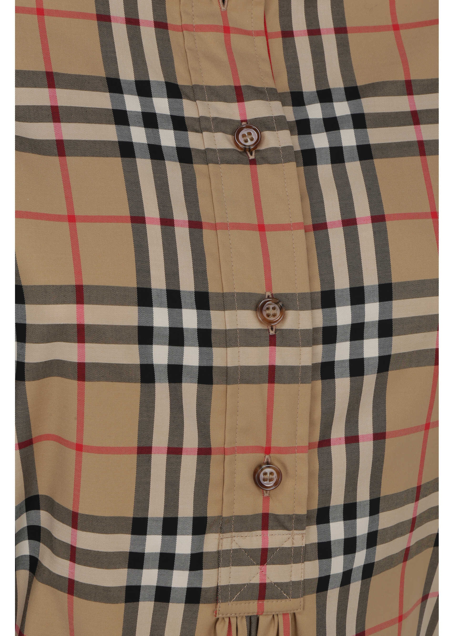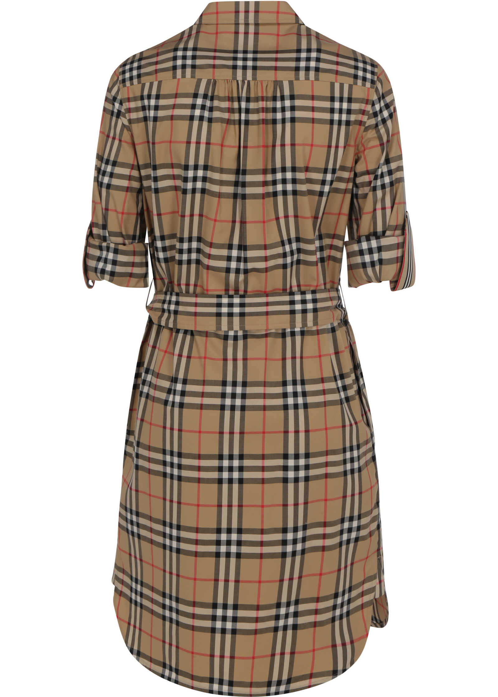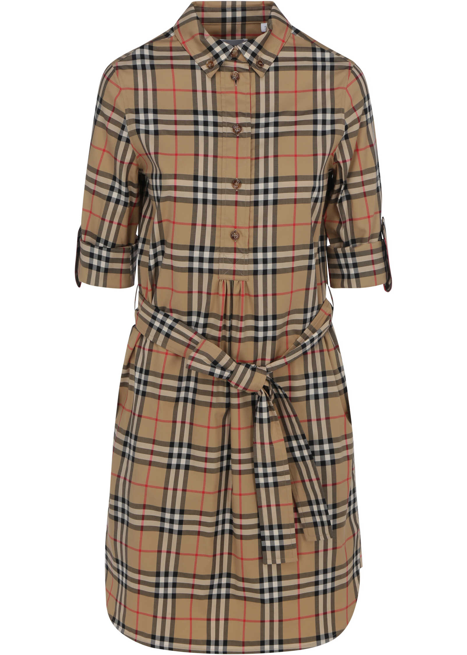 Cotton Giovanna Dress by Burberry, iconic Nova check pattern, button down collar, three-quarter sleeves, buttons closure on front, belt loops, tone-on-tone belt included, welt pockets on front, rounded hem, label inside.