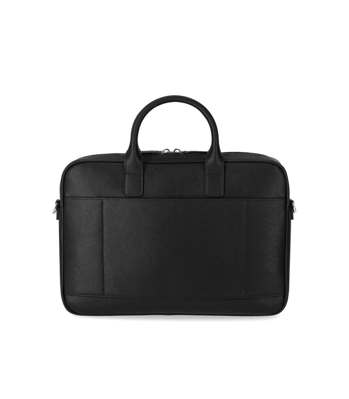 Emporio Armani briefcase made of black regenerated leather with saffiano print. Silver metal details, front logo, lined interior with a special laptop compartment. Upper handles and shoulder strap in logoed, adjustable and removable fabric. Front zip pocket and two-way zip main closure. Measures 37x25x6 cm.