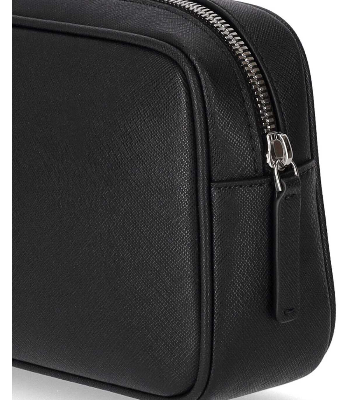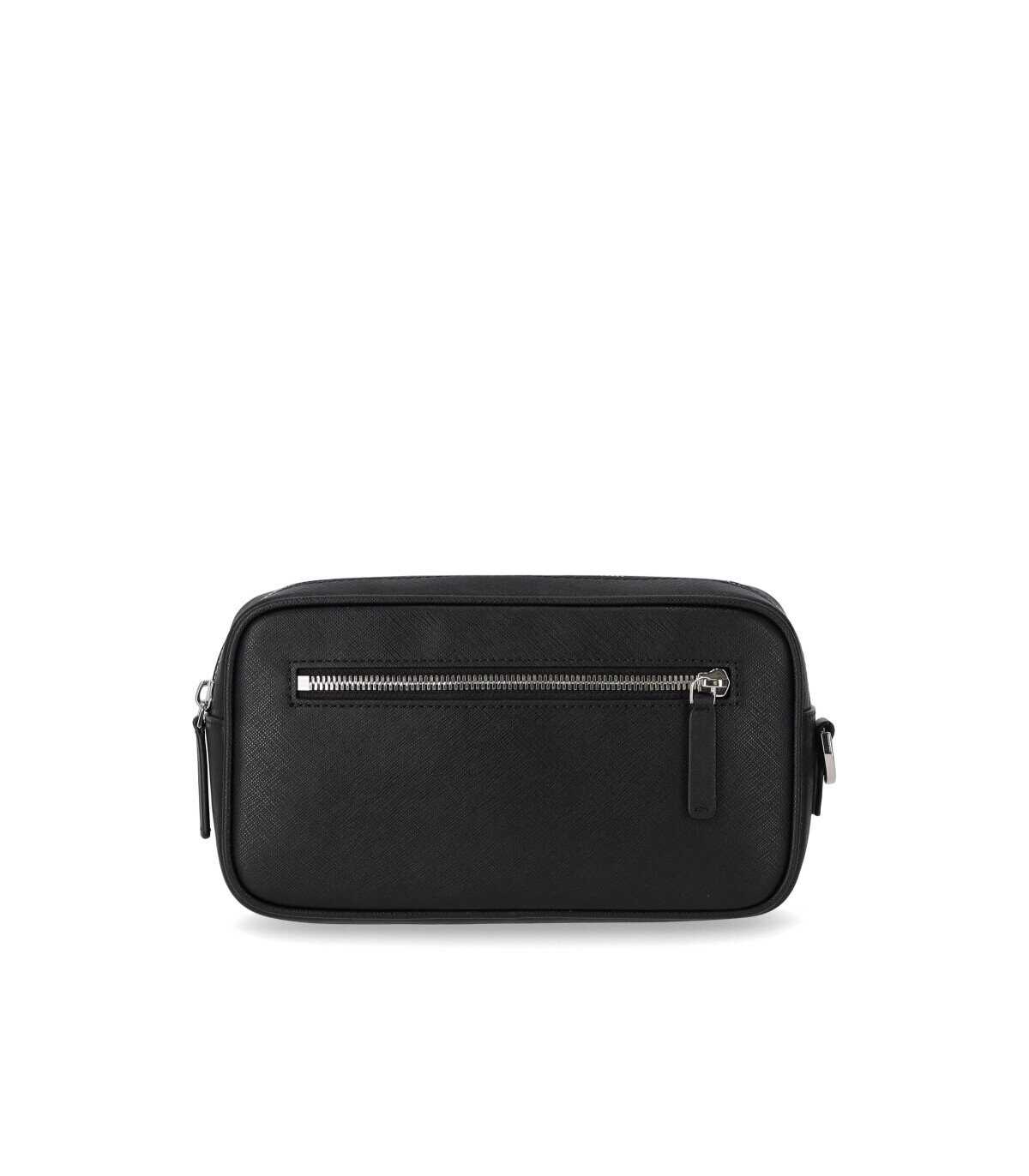 Emporio Armani toiletry bag made of regenerated leather with black saffiano print. Details in silver metal, front logo and removable wrist strap. Lined interior, with slip pocket and zip closure. Measures 21x17x6.5 cm.