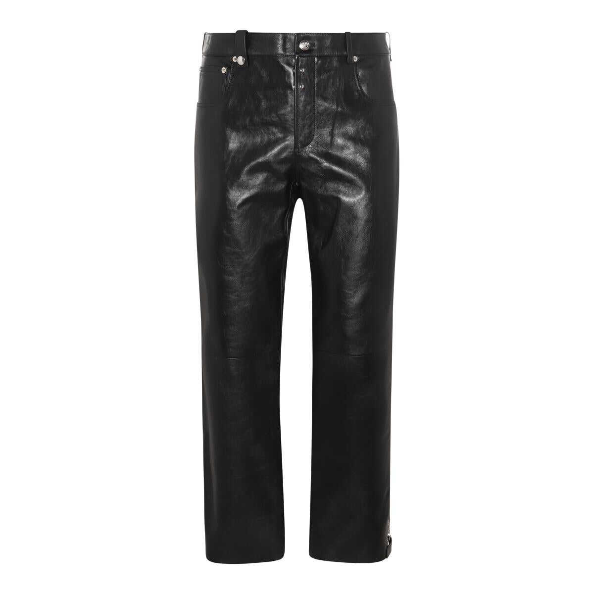 Black leather biker pants from Alexander McQueen featuring high waist, clasice five pockets, zip button fastening and straight leg.