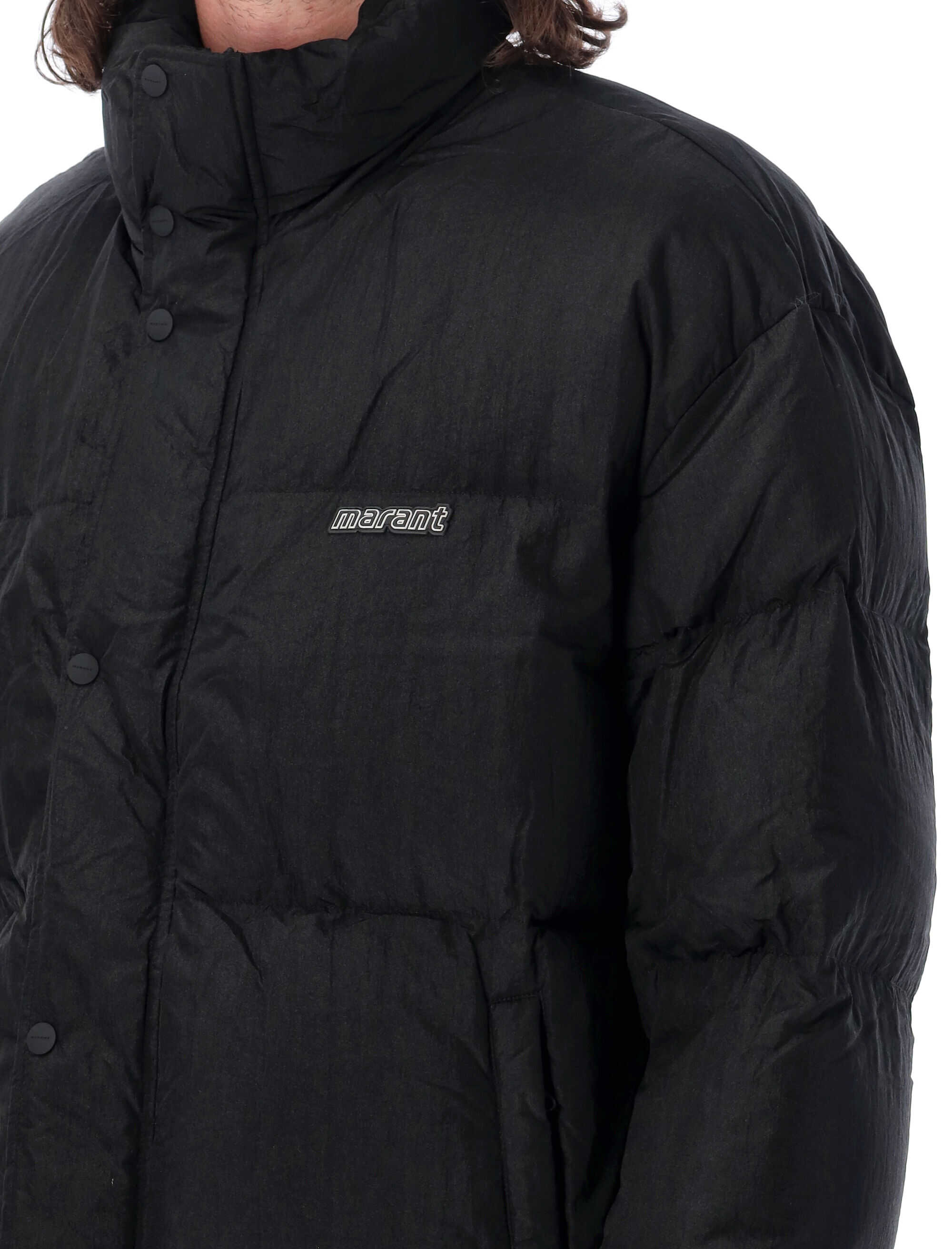 Stay warm and stylish with the BLACK Dilyamo down jacket by MARANT. Made with 100% polyamide, this jacket features a puffed design, zip and button closure, and an elasticized cuffs and hem. It also includes side pockets with zip closure and an oversized fit. The Marant logo at the chest adds a touch of brand authenticity. Perfect for the modern man, this jacket is available in size L. Model is 1,90 m tall.