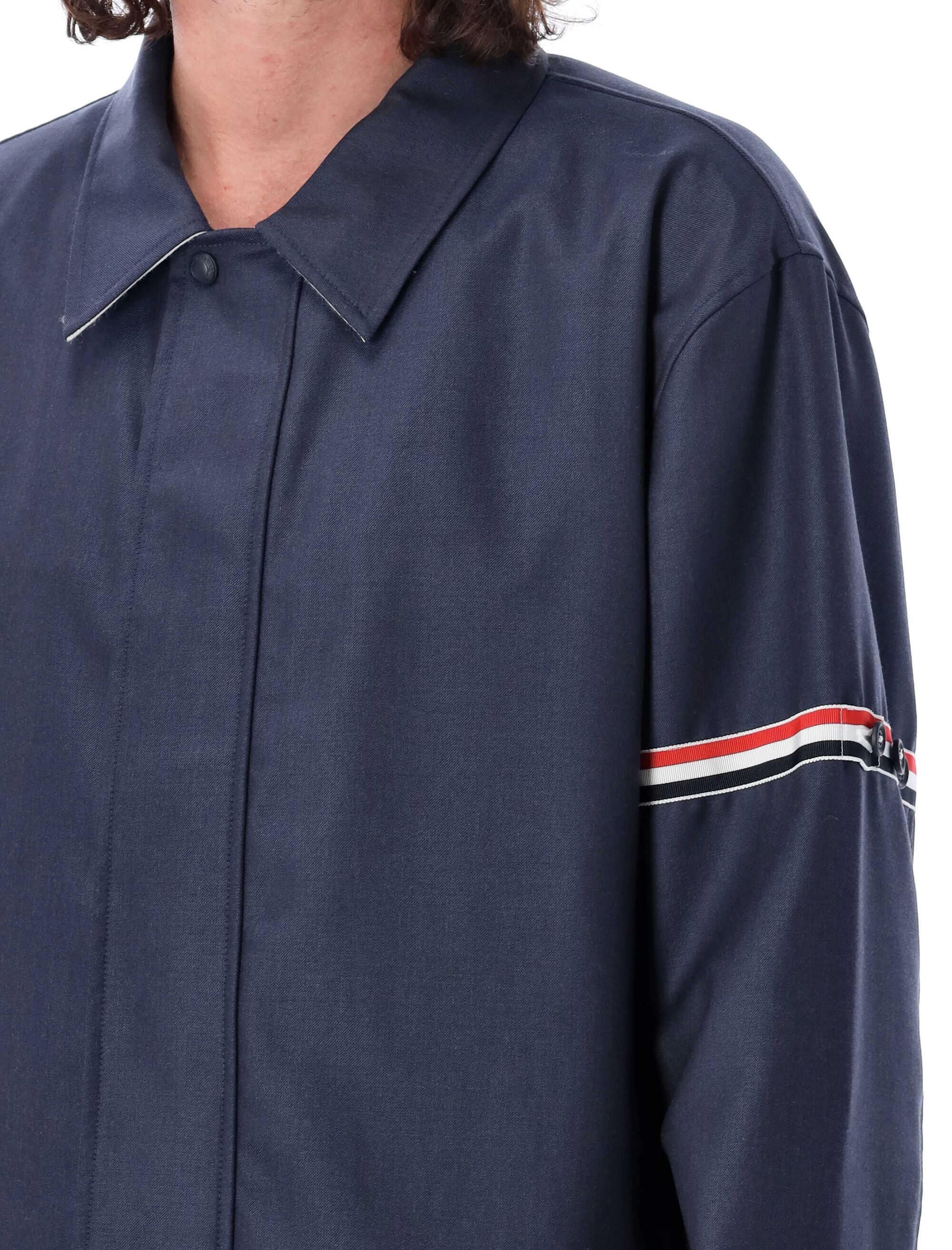 Introducing the stylish Deep Blue Relaxed Zip Front Jacket by Thom Browne. This jacket features a pointed collar, front zip fastening, side pockets, and an adjustable grosgrain armband. The signature grosgrain loop tab at the back of the neck adds a touch of sophistication. Made with 100% wool lining and 100% cotton material. Perfect for men who appreciate relaxed yet fashionable outerwear. Available in various sizes. Order now and elevate your wardrobe!