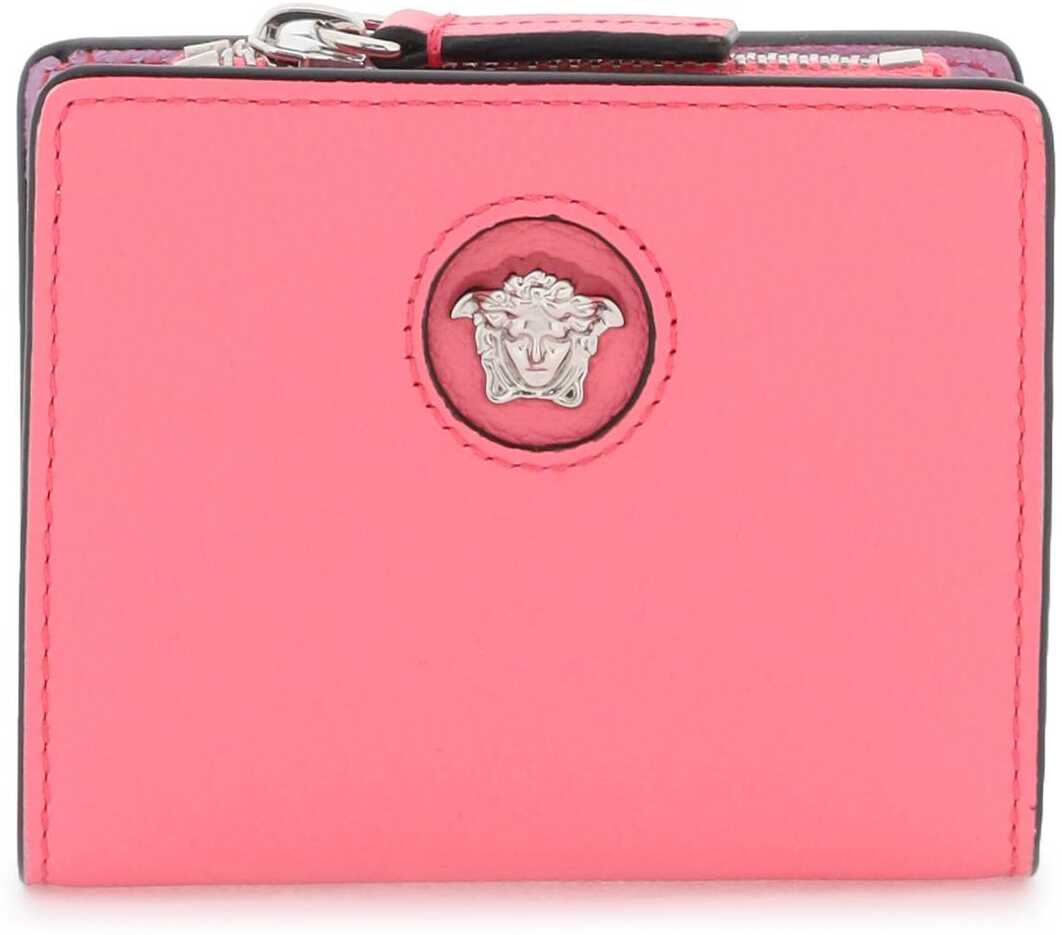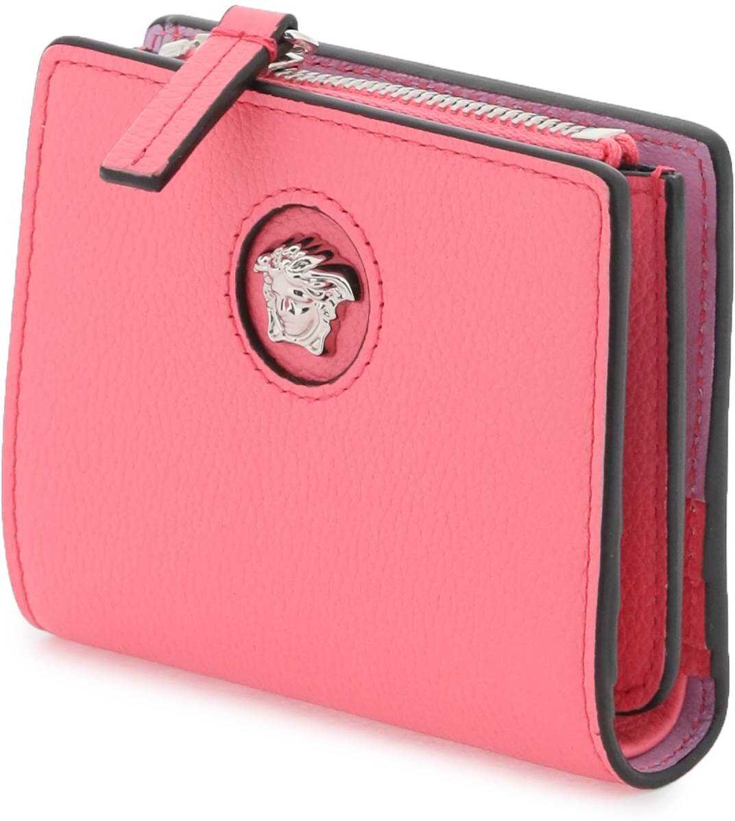 Grained leather bifold wallet by Versace with iconic Medusa applique on the front. Press-button closure, six credit card slots, one bill compartment and one zippered coin pocket. Gold-finished metalware.