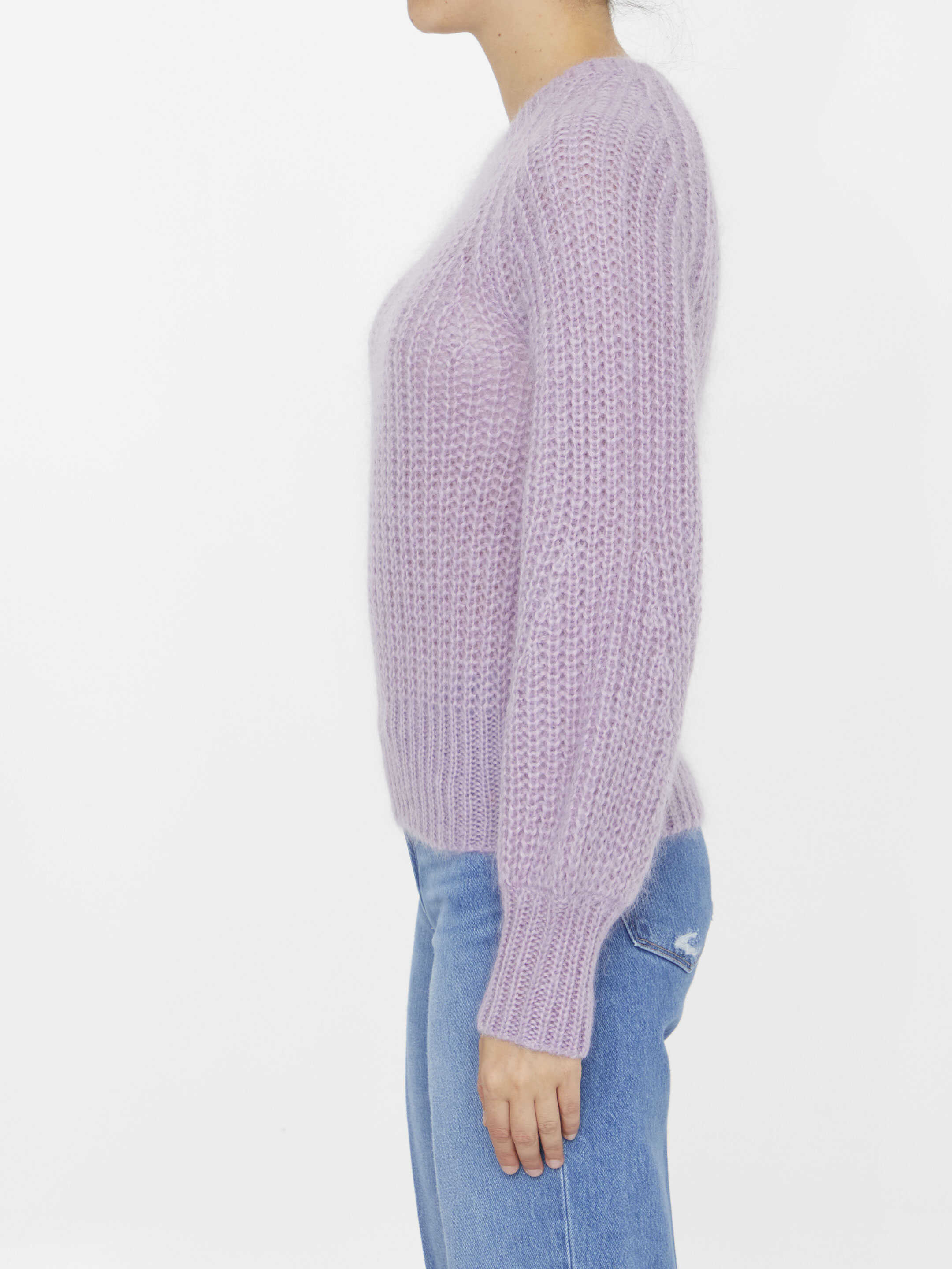 Luminosity Raglan sweater in soft lilac mohair blend with ribbed trims on collar, cuffs and hem. Regular fit.