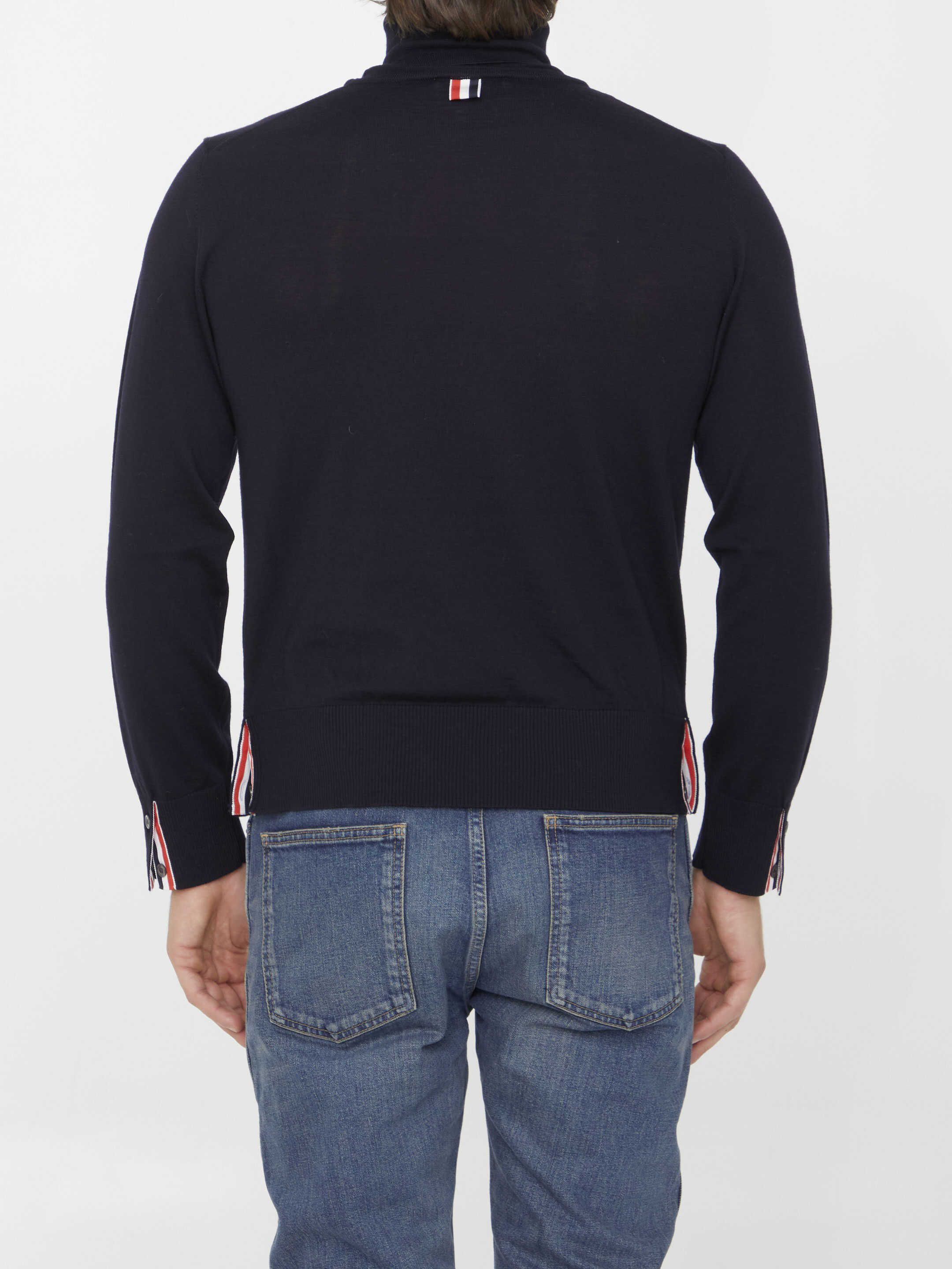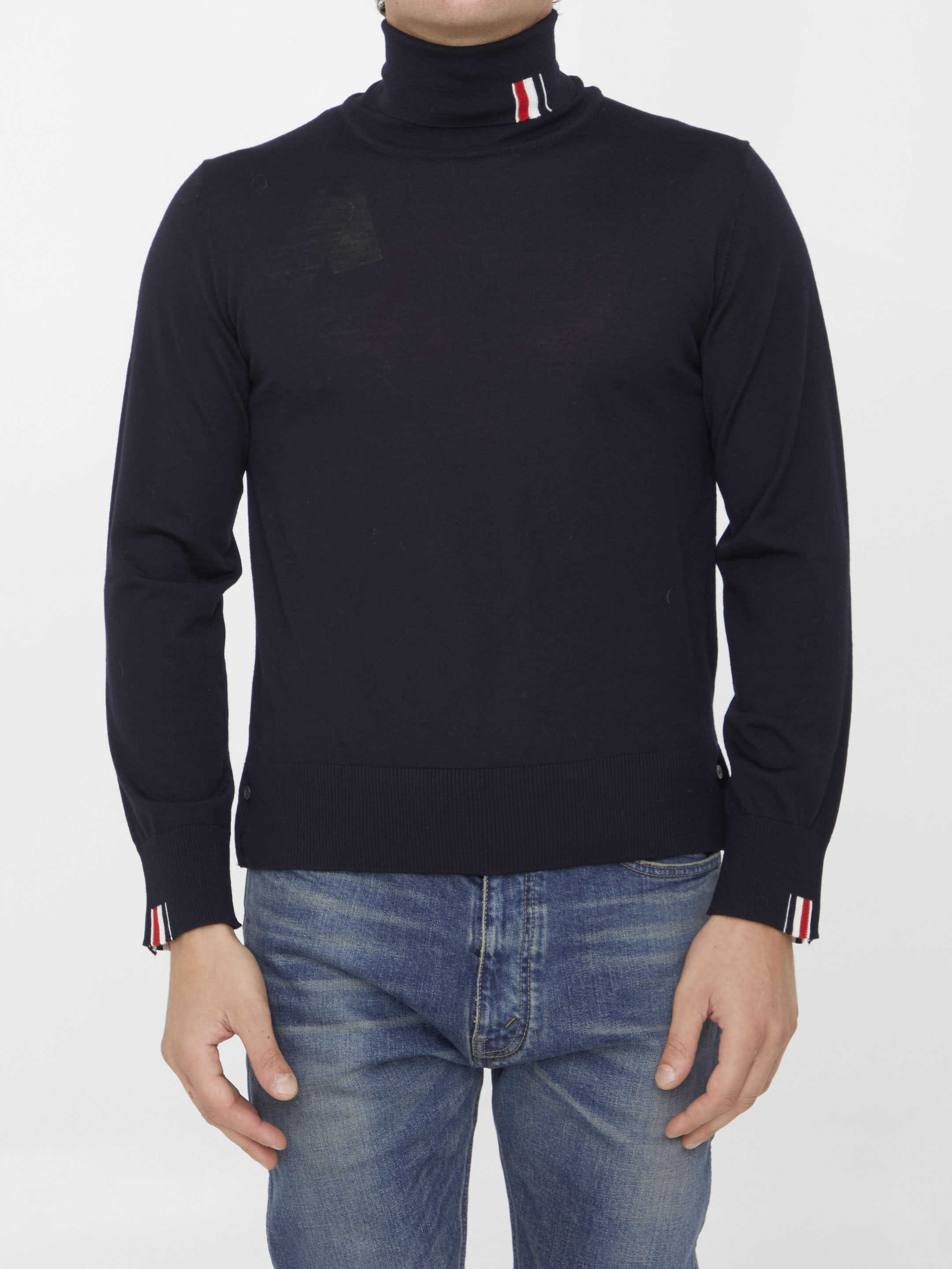 Navy virgin wool turtleneck with tricolor details on collar and sleeves. Buttoned details on both sides and cuffs. Ribbed neck, cuffs and hem. Tight fit.