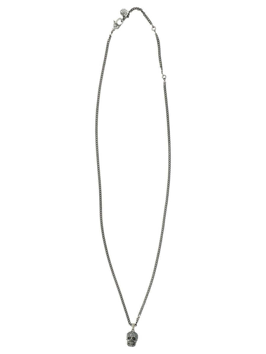 Antique silver-tone brass skull charm necklace from Alexander McQueen featuring skull charm, lobster claw fastening and adjustable fit.